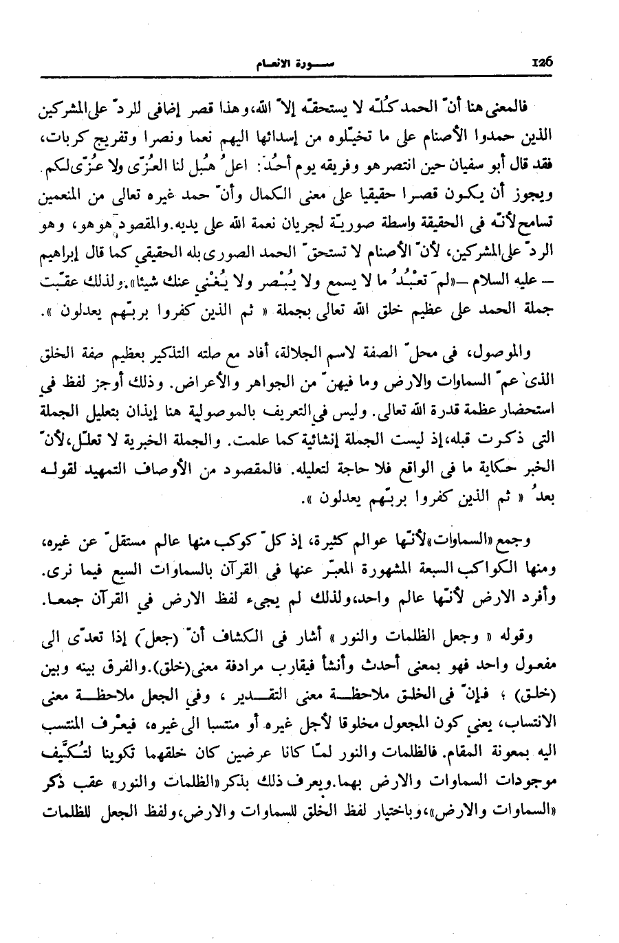 فَالْمَعْنَى هُنَا أَنَّ الْحَمْدَ كُلَّهُ لَا يَسْتَحِقُّهُ إِلَّا اللَّهُ، وَهَذَا قَصْرٌ إِضَافِيٌّ لِلرَّدِّ عَلَى الْمُشْرِكِينَ الَّذِينَ حَمِدُوا الْأَصْنَامَ عَلَى مَا تَخَيَّلُوهُ مِنْ إِسْدَائِهَا إِلَيْهِمْ نِعَمًا وَنَصْرًا وَتَفْرِيجَ كُرُبَاتٍ، فَقَدْ قَالَ أَبُو سُفْيَانَ حِينَ انْتَصَرَ هُوَ وَفَرِيقُهُ يَوْمَ أُحُدٍ: اعْلُ هُبَلُ لَنَا الْعُزَّى وَلَا عُزَّى لَكُمْ. وَيَجُوزُ أَنْ يَكُونَ قَصْرًا حَقِيقِيًّا عَلَى مَعْنَى الْكَمَالِ وَأَنَّ حَمْدَ غَيْرِهِ تَعَالَى مِنَ الْمُنْعِمِينَ تَسَامُحٌ لِأَنَّهُ فِي الْحَقِيقَةِ وَاسِطَةٌ صُورِيَّةٌ لِجَرَيَانِ نِعْمَةِ اللَّهِ عَلَى يَدَيْهِ، وَالْمَقْصُودُ هُوَ هُوَ، وَهُوَ الرَّدُّ عَلَى الْمُشْرِكِينَ، لِأَنَّ الْأَصْنَامَ لَا تَسْتَحِقُّ الْحَمْدَ الصُّورِيَّ بَلْهَ الْحَقِيقِيَّ كَمَا قَالَ إِبْرَاهِيمُ- عَلَيْهِ السَّلَام- «لم نعْبد مَا لَا يَسْمَعُ وَلَا يُبْصِرُ وَلَا يُغْنِي عَنْكَ شَيْئًا» . وَلِذَلِكَ عُقِّبَتْ جُمْلَةُ الْحَمْدِ عَلَى عَظِيمِ خَلْقِ اللَّهِ تَعَالَى بِجُمْلَةِ ثُمَّ الَّذِينَ كَفَرُوا بِرَبِّهِمْ يَعْدِلُونَ.