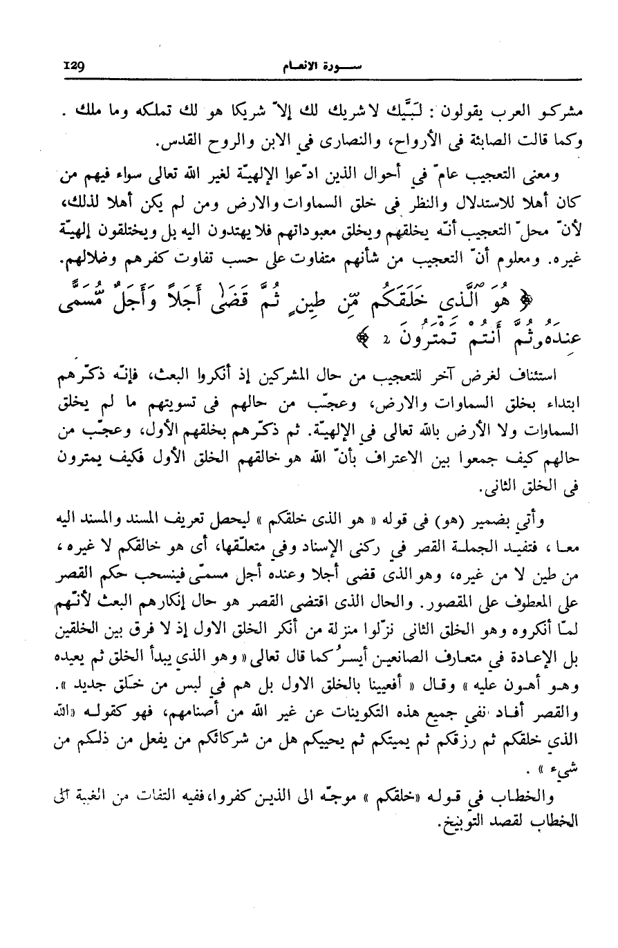 وَأُتِيَ بِضَمِيرِ (هُوَ) فِي قَوْلِهِ هُوَ الَّذِي خَلَقَكُمْ لِيَحْصُلَ تَعْرِيفُ الْمُسْنَدِ وَالْمُسْنَدِ إِلَيْهِ مَعًا، فَتُفِيدُ الْجُمْلَةُ الْقَصْرَ فِي رُكْنَيِ الْإِسْنَادِ وَفِي مُتَعَلِّقِهَا، أَيْ هُوَ خَالِقُكُمْ لَا غَيْرُهُ، مَنْ طِينٍ لَا مَنْ غَيْرِهِ، وَهُوَ الَّذِي قَضَى أَجَلًا وَعِنْدَهُ أَجَلٌ مُسَمًّى فَيَنْسَحِبُ حُكْمُ الْقَصْرِ عَلَى الْمَعْطُوفِ عَلَى الْمَقْصُورِ. وَالْحَالُ الَّذِي اقْتَضَى الْقَصْرَ هُوَ حَالُ إِنْكَارِهِمُ الْبَعْثَ لِأَنَّهُمْ لَمَّا أَنْكَرُوهُ وَهُوَ الْخَلْقُ الثَّانِي نَزَلُوا مَنْزِلَةَ مَنْ أَنْكَرَ الْخَلْقَ الْأَوَّلَ إِذْ لَا فَرْقَ بَيْنَ الْخَلْقَيْنِ بَلِ الْإِعَادَةُ فِي مُتَعَارَفِ الصَّانِعِينَ أَيْسَرُ كَمَا قَالَ تَعَالَى: وَهُوَ الَّذِي يَبْدَؤُا الْخَلْقَ ثُمَّ يُعِيدُهُ وَهُوَ أَهْوَنُ عَلَيْهِ [الرّوم: 27] وَقَالَ أَفَعَيِينا بِالْخَلْقِ الْأَوَّلِ بَلْ هُمْ فِي لَبْسٍ مِنْ خَلْقٍ جَدِيدٍ [ق: