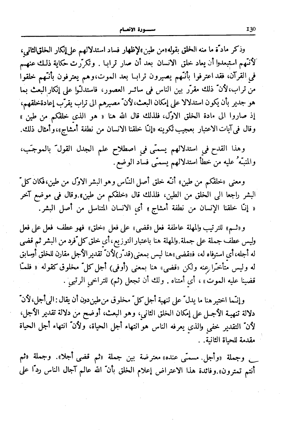 وَمَعْنَى خَلَقَكُمْ مِنْ طِينٍ أَنَّهُ خَلَقَ أَصْلَ النَّاسِ وَهُوَ الْبَشَرُ الْأَوَّلُ مِنْ طِينٍ، فَكَانَ كُلُّ الْبَشَرِ رَاجِعًا إِلَى الْخَلْقِ مِنَ الطِّينِ، فَلِذَلِكَ قَالَ خَلَقَكُمْ مِنْ طِينٍ. وَقَالَ فِي مَوْضِعٍ آخَرَ إِنَّا خَلَقْنَا الْإِنْسانَ مِنْ نُطْفَةٍ أَمْشاجٍ [الْإِنْسَان: 2] أَيِ الْإِنْسَانَ الْمُتَنَاسِلَ مِنْ أَصْلِ الْبَشَرِ.