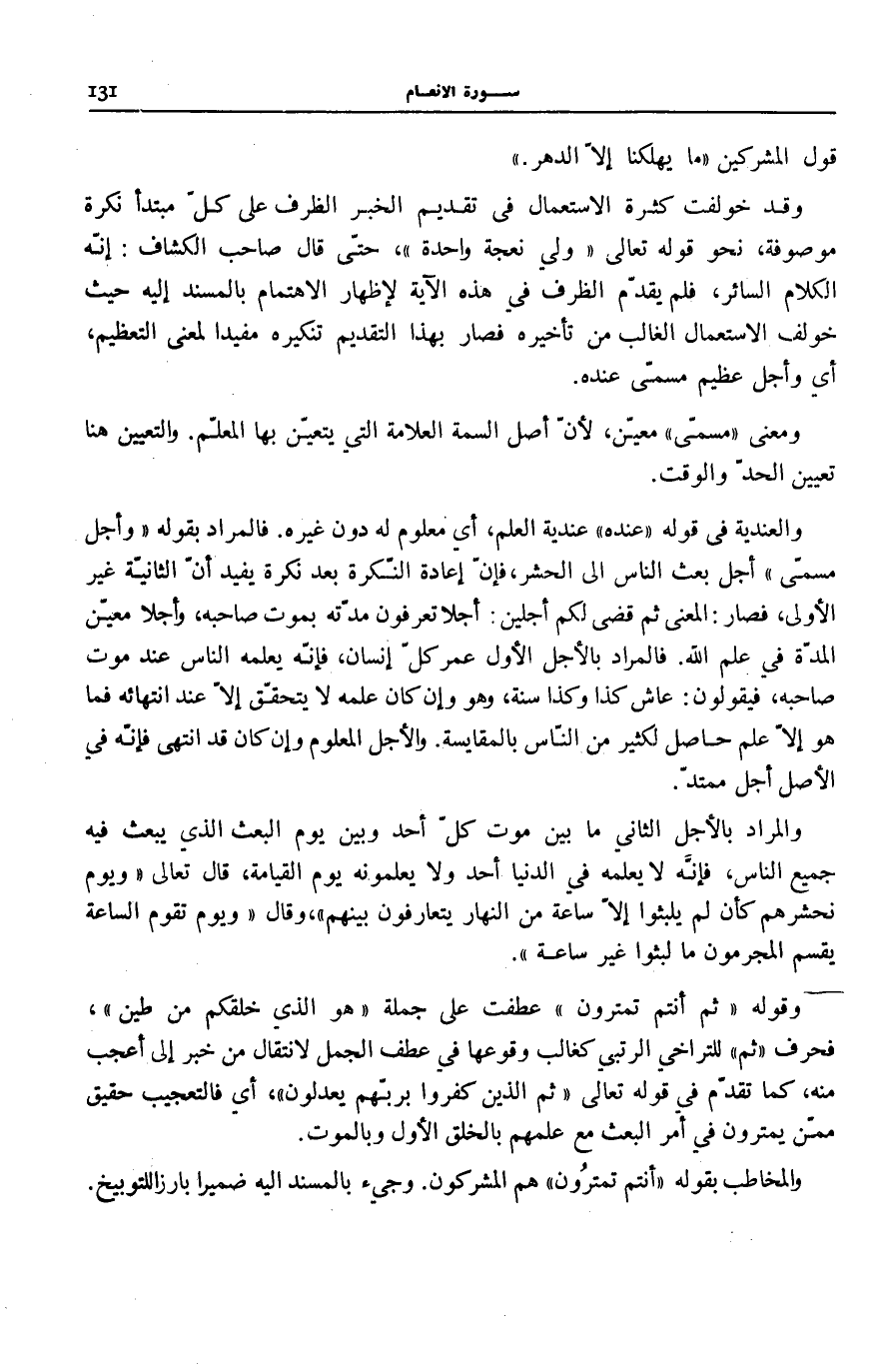 وَأَجَلٌ مُسَمًّى أَجَلُ بَعْثِ النَّاسِ إِلَى الْحَشْرِ، فَإِنَّ إِعَادَةَ النَّكِرَةِ بَعْدَ نَكِرَةٍ يُفِيدُ أَنَّ الثَّانِيَةَ غَيْرُ الْأُولَى، فَصَارَ: الْمَعْنَى ثُمَّ قَضَى لَكُمْ أَجَلَيْنِ: أَجَلًا تَعْرِفُونَ مُدَّتَهُ بِمَوْتِ صَاحِبِهِ، وَأَجَلًا مُعَيَّنَ الْمُدَّةِ فِي عِلْمِ اللَّهِ.