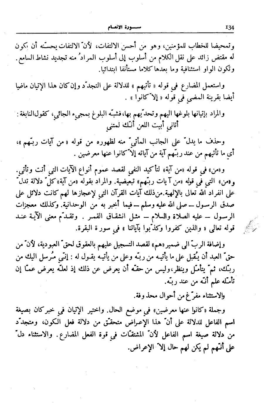 أَتَانِي أَبَيْتَ اللَّعْنَ أَنَّكَ لُمْتَنِي وَحَذَفَ مَا يَدُلُّ عَلَى الْجَانِبِ الْمَأْتِيِّ مِنْهُ لِظُهُورِهِ مِنْ قَوْلِهِ: مِنْ آياتِ رَبِّهِمْ، أَيْ مَا تَأْتِيهِمْ مِنْ عِنْدِ رَبِّهِمْ آيَةٌ مِنْ آيَاتِهِ إِلَّا كَانُوا عَنْهَا مُعْرِضِينَ.