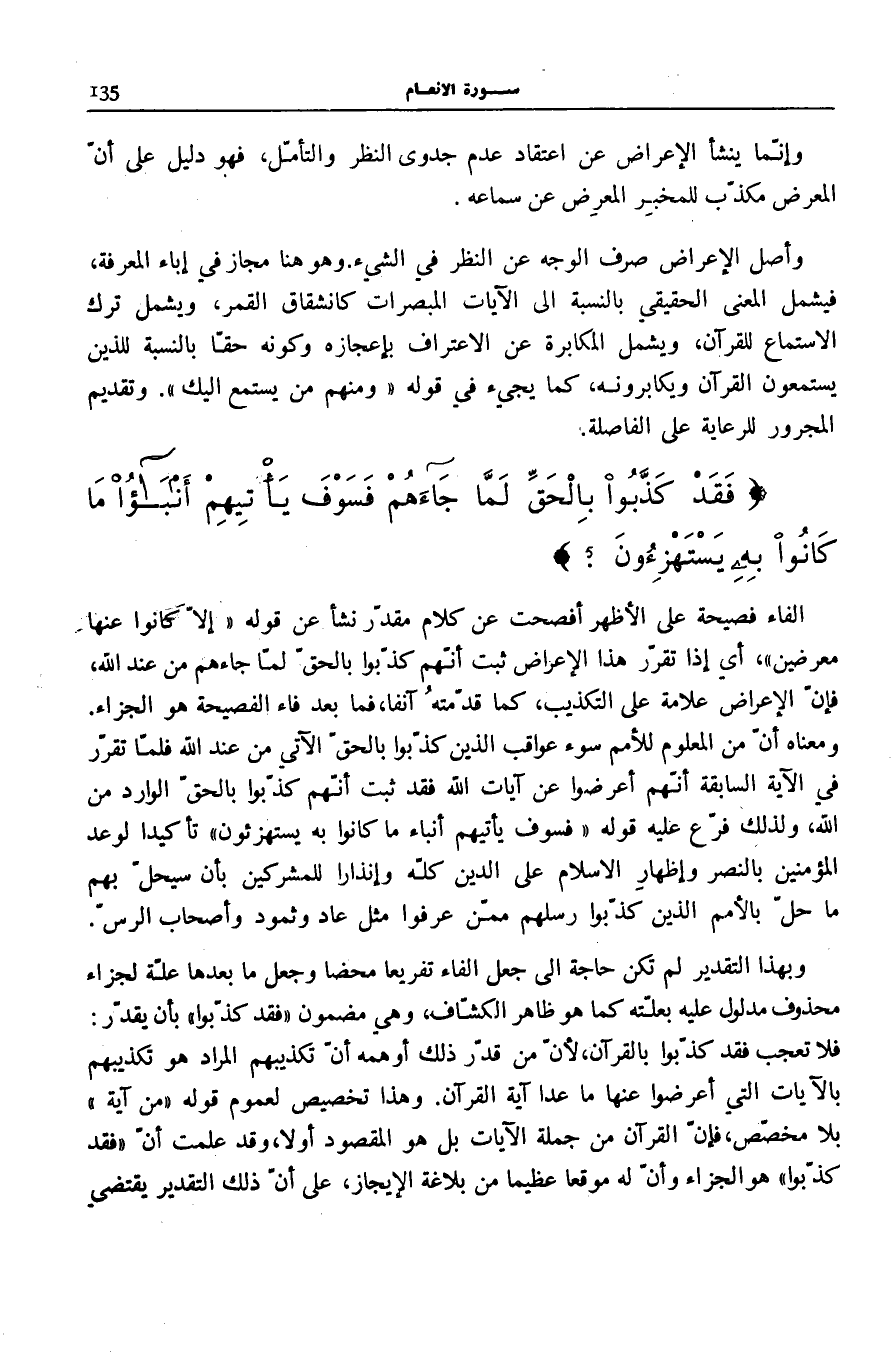 وَبِهَذَا التَّقْدِيرِ لَمْ تَكُنْ حَاجَةٌ إِلَى جَعْلِ الْفَاءِ تَفْرِيعًا مَحْضًا وَجَعْلِ مَا بَعْدَهَا عِلَّةً لِجَزَاءٍ مَحْذُوفٍ مَدْلُولٍ عَلَيْهِ بِعِلَّتِهِ كَمَا هُوَ ظَاهِرُ «الْكَشَّافِ» ، وَهِيَ مَضْمُونُ فَقَدْ كَذَّبُوا بِأَنْ يُقَدَّرَ: فَلَا تَعْجَبْ فَقَدْ كَذَّبُوا بِالْقُرْآنِ، لِأَنَّ مَنْ قَدَّرَ ذَلِكَ أَوْهَمَهُ أَنَّ تَكْذِيبَهُمُ الْمُرَادَ هُوَ تَكْذِيبُهُمْ بِالْآيَاتِ الَّتِي أَعْرَضُوا عَنْهَا مَا عَدَا آيَةَ الْقُرْآنِ. وَهَذَا تَخْصِيصٌ لِعُمُومِ قَوْلِهِ: مِنْ آيَةٍ بِلَا مُخَصِّصٍ، فَإِنَّ الْقُرْآنَ مِنْ جُمْلَةِ الْآيَاتِ بَلْ هُوَ الْمَقْصُودُ أَوَّلًا، وَقَدْ عَلِمْتَ أَنَّ فَقَدْ كَذَّبُوا هُوَ الْجَزَاءُ وَأَنَّ لَهُ مَوْقِعًا عَظِيمًا مِنْ بَلَاغَةِ الْإِيجَازِ، عَلَى أَنَّ ذَلِكَ التَّقْدِيرَ يَقْتَضِي