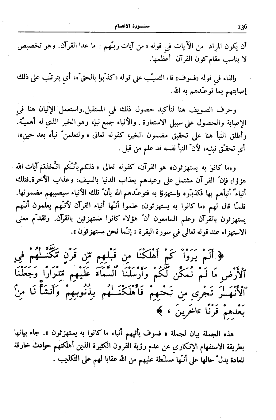 هَذِهِ الْجُمْلَةُ بَيَانٌ لِجُمْلَةِ: فَسَوْفَ يَأْتِيهِمْ أَنْباءُ مَا كانُوا بِهِ يَسْتَهْزِؤُنَ. جَاءَ بَيَانُهَا بِطَرِيقَةِ الِاسْتِفْهَامِ الْإِنْكَارِيِّ عَنْ عَدَمِ رُؤْيَةِ الْقُرُونِ الْكَثِيرَةِ الَّذِينَ أَهْلَكَتْهُمْ حَوَادِثُ خَارِقَةٌ لِلْعَادَةِ يَدُلُّ حَالُهَا عَلَى أَنَّهَا مُسَلَّطَةٌ عَلَيْهِمْ مِنَ اللَّهِ عِقَابًا لَهُمْ عَلَى التَّكْذِيبِ.