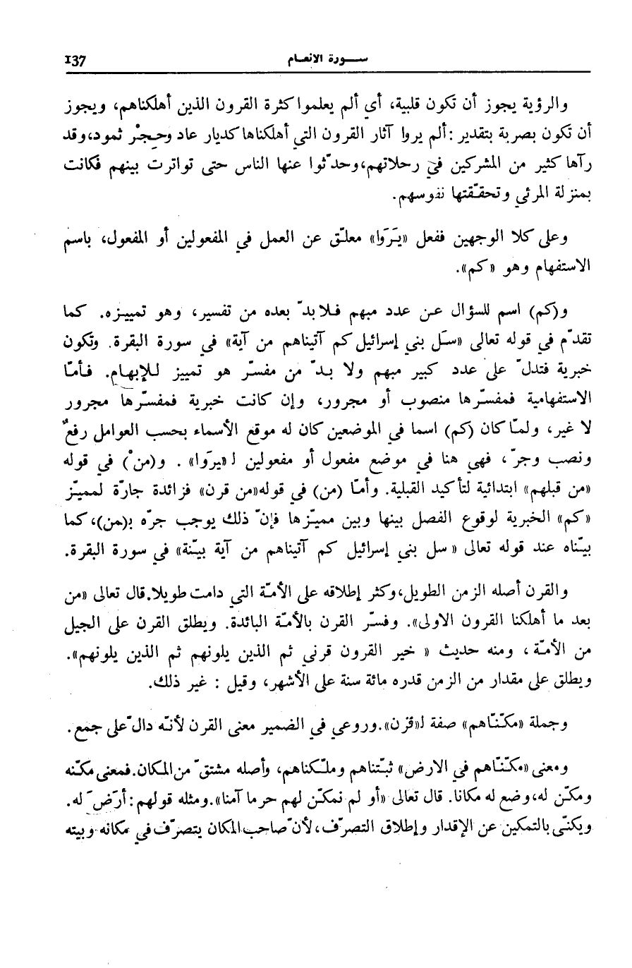 وَ (كَمِ) اسْمٌ لِلسُّؤَالِ عَنْ عَدَدٍ مُبْهَمٍ فَلَا بُدَّ بَعْدَهُ مِنْ تَفْسِيرٍ، وَهُوَ تَمْيِيزُهُ. كَمَا تَقَدَّمَ فِي قَوْلِهِ تَعَالَى: سَلْ بَنِي إِسْرائِيلَ كَمْ آتَيْناهُمْ مِنْ آيَةٍ فِي سُورَةِ الْبَقَرَةِ [] وَتَكُونُ خَبَرِيَّةً فَتَدُلُّ عَلَى عَدَدٍ كَبِيرٍ مُبْهَمٍ وَلَا بُدَّ مِنْ مُفَسِّرٍ هُوَ تَمْيِيزٌ لِلْإِبْهَامِ. فَأَمَّا الِاسْتِفْهَامِيَّةُ فَمُفَسِّرُهَا مَنْصُوبٌ أَوْ مَجْرُورٌ، وَإِنْ كَانَتْ خَبَرِيَّةً فَمُفَسِّرُهَا مَجْرُورٌ لَا غَيْرَ، وَلَمَّا كَانَ (كَمِ) اسْمًا فِي الْمَوْضِعَيْنِ كَانَ لَهُ مَوْقِعُ الْأَسْمَاءِ بِحَسَبِ الْعَوَامِلِ رَفْعٌ وَنَصْبٌ وَجَرٌّ، فَهِيَ هُنَا فِي مَوْضِعِ مَفْعُولٍ أَوْ مَفْعُولَيْنِ لِـ يَرَوْا. وَ (مِنْ) مِنْ فِي قَوْلِهِ مِنْ قَبْلِهِمْ ابْتِدَائِيَّةٌ لِتَأْكِيدِ الْقَبْلِيَّةِ. وَأَمَّا مِنْ فِي قَوْلِهِ مِنْ قَرْنٍ فَزَائِدَةٌ جَارَّةٌ لِمُمَيِّزِ كَمْ الْخَبَرِيَّةِ لِوُقُوعِ الْفَصْلِ بَيْنَهَا وَبَيْنَ مُمَيِّزِهَا فَإِنَّ ذَلِكَ يُوجِبُ جَرَّهُ بِ (مِنْ) ، كَمَا بَيَّنَاهُ عِنْدَ قَوْلِهِ تَعَالَى: سَلْ بَنِي إِسْرائِيلَ كَمْ آتَيْناهُمْ مِنْ آيَةٍ بَيِّنَةٍ فِي سُورَةِ الْبَقَرَةِ.