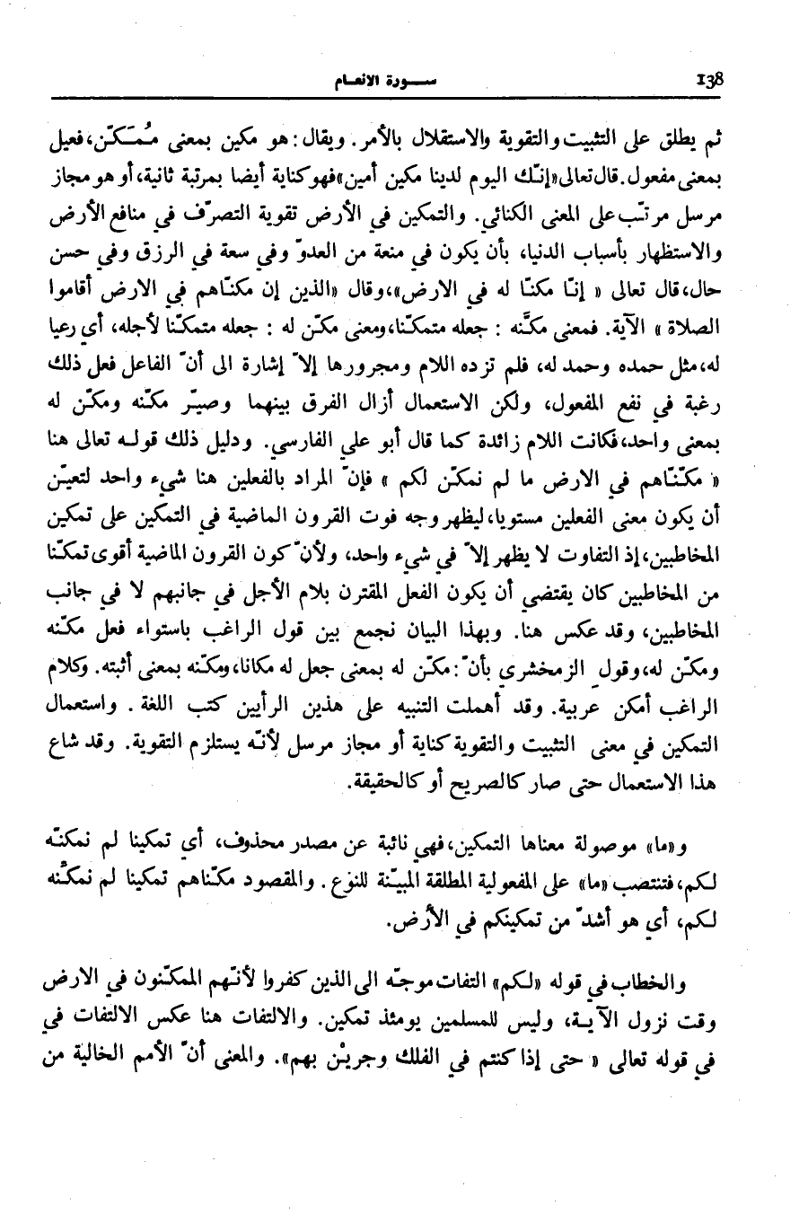 جَعَلَهُ مُتَمَكِّنًا لِأَجْلِهِ، أَيْ رَعْيًا لَهُ، مِثْلَ حَمِدَهُ وَحَمِدَ لَهُ، فَلَمْ تزِدْه اللَّام ومجروورها إِلَّا إِشَارَةً إِلَى أَنَّ الْفَاعِلَ فَعَلَ ذَلِكَ رَغْبَةً فِي نَفْعِ الْمَفْعُولِ، وَلَكِنَّ الِاسْتِعْمَالَ أَزَالَ الْفَرْقَ بَيْنَهُمَا وَصَيَّرَ مَكَّنَهُ وَمَكَّنَ لَهُ بِمَعْنًى وَاحِدٍ، فَكَانَتِ اللَّامُ زَائِدَةً كَمَا قَالَ أَبُو عَلِيٍّ الْفَارِسِيُّ. وَدَلِيلُ ذَلِكَ قَوْلُهُ تَعَالَى: هُنَا مَكَّنَّاهُمْ فِي الْأَرْضِ مَا لَمْ نُمَكِّنْ لَكُمْ فَإِنَّ الْمُرَادَ بِالْفِعْلَيْنِ هُنَا شَيْءٌ وَاحِدٌ لِتَعَيُّنِ أَنْ يَكُونَ مَعْنَى الْفِعْلَيْنِ مُسْتَوِيًا، لِيَظْهَرَ وَجْهُ فَوْتِ الْقُرُونِ الْمَاضِيَةِ فِي التَّمْكِينِ عَلَى تَمْكِينِ الْمُخَاطَبِينَ، إِذِ التَّفَاوُتُ لَا يَظْهَرُ إِلَّا فِي شَيْءٍ وَاحِدٍ، وَلِأَنَّ كَوْنَ الْقُرُونِ الْمَاضِيَةِ أَقْوَى تَمَكُّنًا مِنَ الْمُخَاطَبِينَ كَانَ يَقْتَضِي أَنْ يَكُونَ الْفِعْلُ الْمُقْتَرِنُ بِلَامِ الْأَجَلِ فِي جَانِبِهِمْ لَا فِي جَانِبِ الْمُخَاطَبِينَ، وَقَدْ عُكِسَ هُنَا. وَبِهَذَا الْبَيَانِ نَجْمَعُ بَيْنَ قَوْلِ الرَّاغِبِ بِاسْتِوَاءِ فِعْلِ مَكَّنَهُ وَمَكَّنَ لَهُ، وَقَوْلِ الزَّمَخْشَرِيِّ بِأَنَّ: مَكَّنَ لَهُ بِمَعْنَى جَعَلَ لَهُ مَكَانًا، وَمَكَّنَهُ بِمَعْنَى أَثْبَتَهُ. وَكَلَامُ الرَّاغِبِ أَمْكَنُ عَرَبِيَّةً. وَقَدْ أَهْمَلَتِ التَّنْبِيهَ عَلَى هَذَيْنِ الرَّأْيَيْنِ كُتُبُ اللُّغَةِ.