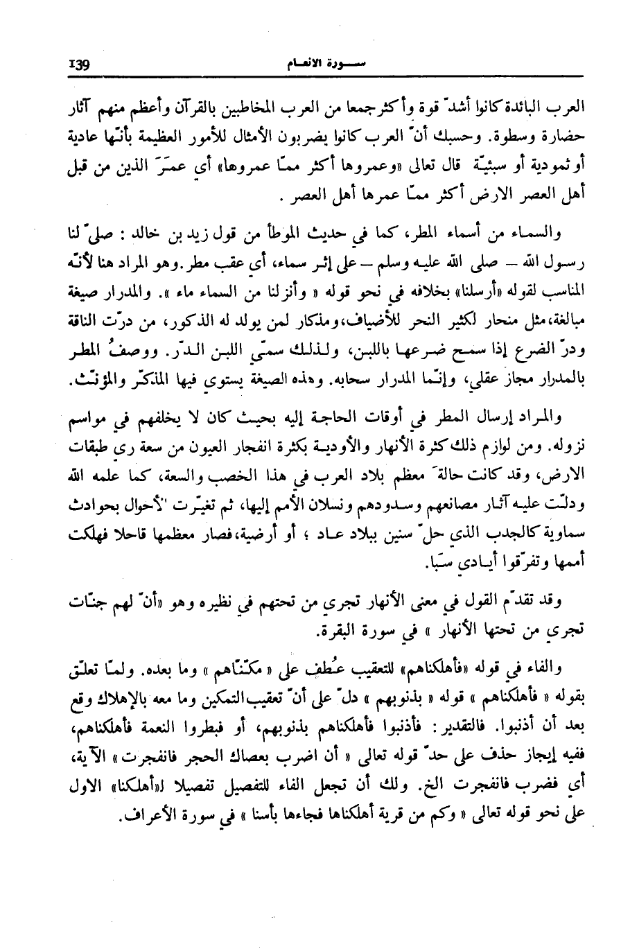 وَالْمُرَادُ إِرْسَالُ الْمَطَرِ فِي أَوْقَاتِ الْحَاجَةِ إِلَيْهِ بِحَيْثُ كَانَ لَا يُخَلِّفُهُمْ فِي مَوَاسِمِ نُزُولِهِ. وَمِنْ لَوَازِمِ ذَلِكَ كَثْرَةُ الْأَنْهَارِ وَالْأَوْدِيَةِ بِكَثْرَةِ انْفِجَارِ الْعُيُونِ مِنْ سِعَةِ رِيِّ طَبَقَاتِ الْأَرْضِ، وَقَدْ كَانَتْ حَالَةُ مُعْظَمِ بِلَادِ الْعَرَبِ فِي هَذَا الْخِصْبِ وَالسِّعَةِ، كَمَا عَلِمَهُ اللَّهُ وَدَلَّتْ عَلَيْهِ آثَارُ مَصَانِعِهِمْ وَسُدُودِهِمْ وَنَسَلَانُ الْأُمَمِ إِلَيْهَا، ثُمَّ تَغَيَّرَتِ الْأَحْوَالُ بِحَوَادِثَ سَمَاوِيَّةٍ كَالْجَدْبِ الَّذِي حَلَّ سِنِينَ بِبِلَادِ عَادٍ، أَوْ أَرْضِيَّةٍ، فَصَارَ مُعْظَمُهَا قَاحِلًا فَهَلَكَتْ أُمَمُهَا وَتَفَرَّقُوا أَيَادِيَ سَبَا.
