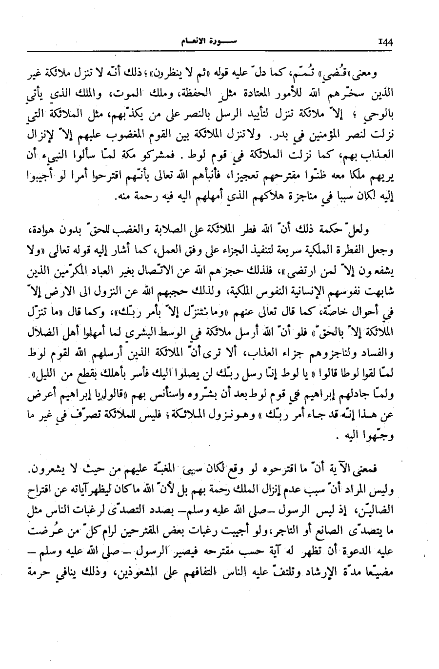 وَلا يَشْفَعُونَ إِلَّا لِمَنِ ارْتَضى، فَلِذَلِكَ حَجَزَهُمُ اللَّهُ عَنِ الِاتِّصَالِ بِغَيْرِ الْعِبَادِ المكرّمين الَّذين شابهن نُفُوسُهُمُ الْإِنْسَانِيَّةُ النُّفُوسَ الْمَلَكِيَّةَ، وَلِذَلِكَ حَجَبَهُمُ اللَّهُ عَنِ النُّزُولِ إِلَى الْأَرْضِ إِلَّا فِي أَحْوَالٍ خَاصَّةٍ، كَمَا قَالَ تَعَالَى عَنْهُمْ: وَما نَتَنَزَّلُ إِلَّا بِأَمْرِ رَبِّكَ، وَكَمَا قَالَ: مَا نُنَزِّلُ الْمَلائِكَةَ إِلَّا بِالْحَقِّ فَلَوْ أَنَّ اللَّهَ أَرْسَلَ مَلَائِكَةً فِي الْوَسَطِ الْبَشَرِيِّ لَمَا أَمْهَلُوا أَهْلَ الضلال وَالْفساد وَلنَا جزوهم جَزَاءَ الْعَذَابِ، أَلَا تَرَى أَنَّ الْمَلَائِكَةَ الَّذِينَ أَرْسَلَهُمُ اللَّهُ لِقَوْمِ لُوطٍ لَمَّا لَقُوا لُوطًا قَالُوا: يَا لُوطُ إِنَّا رُسُلُ رَبِّكَ لَنْ يَصِلُوا إِلَيْكَ فَأَسْرِ بِأَهْلِكَ بِقِطْعٍ مِنَ اللَّيْلِ. وَلَمَّا جَادَلَهُمْ إِبْرَاهِيمُ فِي قَوْمِ لُوطٍ بَعْدَ أَنْ بَشَّرُوهُ وَاسْتَأْنَسَ بِهِمْ قَالُوا يَا إِبْراهِيمُ