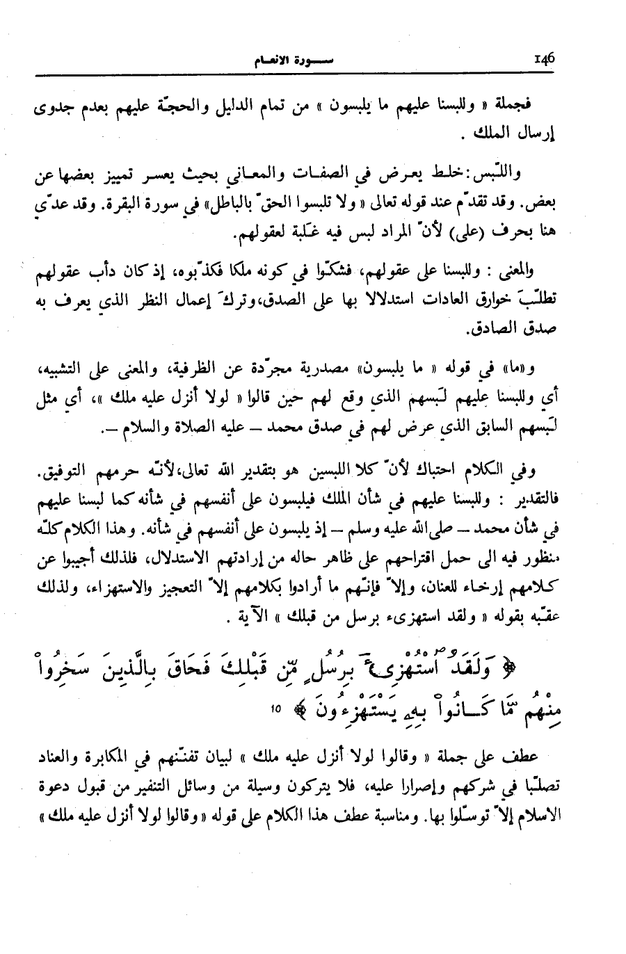 فَالتَّقْدِيرُ: وَلَلَبَسْنَا عَلَيْهِمْ فِي شَأْنِ الْمَلَكِ فَيَلْبِسُونَ عَلَى أَنْفُسِهِمْ فِي شَأْنِهِ كَمَا لَبَسْنَا عَلَيْهِمْ فِي شَأْنِ مُحَمَّدٍ صَلَّى اللهُ عَلَيْهِ وَسَلَّمَ إِذْ يَلْبِسُونَ عَلَى أَنْفُسِهِمْ فِي شَأْنِهِ. وَهَذَا الْكَلَامُ كُلُّهُ مَنْظُورٌ فِيهِ إِلَى حَمْلِ اقْتِرَاحِهِمْ عَلَى ظَاهِرِ حَالِهِ مِنْ إِرَادَتِهِمُ الِاسْتِدْلَالَ، فَلِذَلِكَ أُجِيبُوا عَنْ كَلَامِهِمْ إِرْخَاءً لِلْعِنَانِ، وَإِلَّا فَإِنَّهُمْ مَا أَرَادُوا بِكَلَامِهِمْ إِلَّا التَّعْجِيزَ وَالِاسْتِهْزَاءَ، وَلِذَلِكَ عَقَّبَهُ بِقَوْلِهِ: وَلَقَدِ اسْتُهْزِئَ بِرُسُلٍ مِنْ قَبْلِكَ الْآيَة.