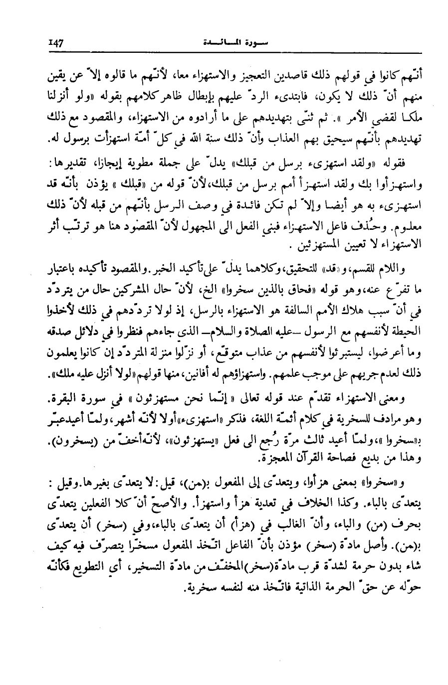 وَقِيلَ: يَتَعَدَّى بِالْبَاءِ. وَكَذَا الْخِلَافُ فِي تَعْدِيَةِ هَزَأَ وَاسْتَهْزَأَ. وَالْأَصَحُّ أَنَّ كِلَا الْفِعْلَيْنِ يَتَعَدَّى بِحَرْفِ (مِنْ) وَالْبَاءِ، وَأَنَّ الْغَالِبَ فِي (هَزَأَ) أَنْ يَتَعَدَّى بِالْبَاءِ، وَفِي سَخِرَ أَن يتعدّى بِمن. وَأَصْلُ مَادَّةِ سَخِرَ مُؤْذِنٌ بِأَنَّ الْفَاعِلَ اتَّخَذَ الْمَفْعُولَ مُسَخَّرًا يَتَصَرَّفُ فِيهِ كَيْفَ شَاءَ بِدُونِ حُرْمَةٍ لِشِدَّةِ قُرْبِ مَادَّةِ سَخِرَ الْمُخَفَّفِ مِنْ مَادَّةِ التَّسْخِيرِ، أَيِ التَّطْوِيعِ فَكَأَنَّهُ حَوَّلَهُ عَنْ حَقِّ الْحُرْمَةِ الذَّاتِيَّةِ فَاتَّخَذَ مِنْهُ لِنَفْسِهِ سُخْرِيَةً.
