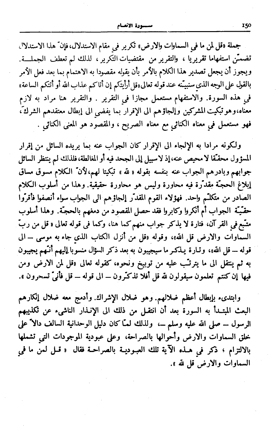 جُمْلَةُ قُلْ لِمَنْ مَا فِي السَّماواتِ وَالْأَرْضِ تَكْرِيرٌ فِي مَقَامِ الِاسْتِدْلَالِ، فَإِنَّ هَذَا الِاسْتِدْلَالَ تَضَمَّنَ اسْتِفْهَامًا تَقْرِيرِيًّا، والتقرير من مقتضيان التَّكْرِيرِ، لِذَلِكَ لَمْ تُعْطَفِ الْجُمْلَةُ. وَيَجُوزُ أَنْ يُجْعَلَ تَصْدِيرُ هَذَا الْكَلَامِ بِالْأَمْرِ بِأَنْ يَقُولَهُ مَقْصُودًا بِهِ الِاهْتِمَامُ بِمَا بَعْدَ فِعْلِ الْأَمْرِ بِالْقَوْلِ عَلَى الْوَجْهِ الَّذِي سَنُبَيِّنُهُ عِنْدَ قَوْلِهِ تَعَالَى: قُلْ أَرَأَيْتَكُمْ إِنْ أَتاكُمْ عَذابُ اللَّهِ أَوْ أَتَتْكُمُ السَّاعَةُ فِي هَذِهِ السُّورَةِ [40] . وَالِاسْتِفْهَامُ مُسْتَعْمَلٌ مَجَازًا فِي التَّقْرِيرِ.