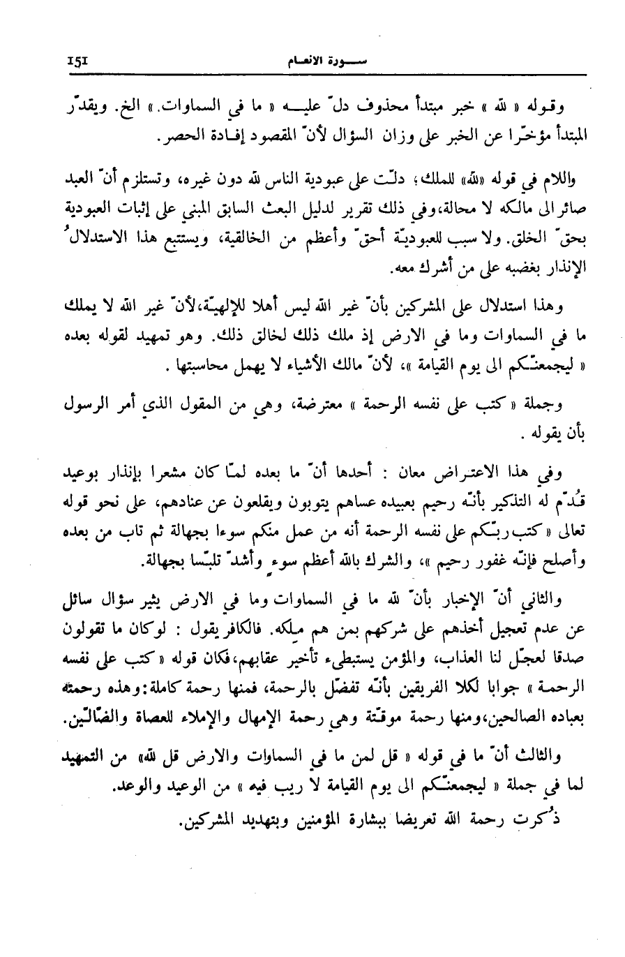 وَالثَّانِي: أَنَّ الْإِخْبَارَ بِأَنَّ لِلَّهِ مَا فِي السَّمَاوَاتِ وَمَا فِي الْأَرْضِ يُثِيرُ سُؤَالَ سَائِلٍ عَنْ عَدَمِ تَعْجِيلِ أَخْذِهِمْ عَلَى شِرْكِهِمْ بِمَنْ هُمْ مِلْكُهُ. فَالْكَافِرُ يَقُولُ: لَوْ كَانَ مَا تَقُولُونَ صِدْقًا لَعَجَّلَ لَنَا الْعَذَاب، وَالْمُؤمن يستبطىء تَأْخِيرَ عِقَابِهِمْ، فَكَانَ قَوْلُهُ: كَتَبَ عَلى نَفْسِهِ الرَّحْمَةَ جَوَابًا لِكِلَا الْفَرِيقَيْنِ بِأَنَّهُ تَفَضُّلٌ بِالرَّحْمَةِ، فَمِنْهَا رَحْمَةٌ كَامِلَةٌ: وَهَذِهِ رَحْمَتُهُ بِعِبَادِهِ الصَّالِحِينَ، وَمِنْهَا رَحْمَةٌ مُوَقَّتَةٌ وَهِيَ رَحْمَةُ الْإِمْهَالِ وَالْإِمْلَاءِ لِلْعُصَاةِ وَالضَّالِّينَ.
