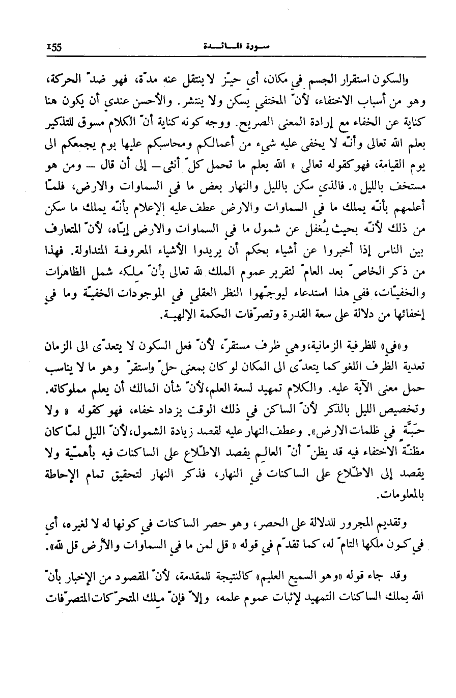 وَالسُّكُونُ اسْتِقْرَارُ الْجِسْمِ فِي مَكَانٍ، أَيْ حَيِّزٍ لَا يَنْتَقِلُ عَنْهُ مُدَّةً، فَهُوَ ضِدُّ الْحَرَكَةِ، وَهُوَ مِنْ أَسْبَابِ الِاخْتِفَاءِ، لِأَنَّ الْمُخْتَفِيَ يَسْكُنُ وَلَا يَنْتَشِرُ. وَالْأَحْسَنُ عِنْدِي أَنْ يَكُونَ هُنَا كِنَايَةً عَنِ الْخَفَاءِ مَعَ إِرَادَةِ الْمَعْنَى الصَّرِيحِ. وَوَجْهُ كَوْنِهِ كِنَايَةً أَنَّ الْكَلَامَ مَسُوقٌ لِلتَّذْكِيرِ بِعِلْمِ اللَّهِ تَعَالَى وَأَنَّهُ لَا يَخْفَى عَلَيْهِ شَيْءٌ مِنْ أَعْمَالِكُمْ وَمُحَاسِبُكُمْ عَلَيْهَا يَوْمَ يَجْمَعُكُمْ إِلَى يَوْمِ الْقِيَامَةِ، فَهُوَ كَقَوْلِهِ تَعَالَى: اللَّهُ يَعْلَمُ مَا تَحْمِلُ كُلُّ أُنْثى - إِلَى أَنْ قَالَ- وَمَنْ هُوَ مُسْتَخْفٍ بِاللَّيْلِ [الرَّعْد: 8- 10] . فَالَّذِي سكن بِاللَّيْلِ وَالنَّهَارَ بَعْضُ مَا فِي السَّمَاوَاتِ وَالْأَرْضِ، فَلَمَّا أَعْلَمَهُمْ بِأَنَّهُ يَمْلِكُ مَا فِي السَّمَوَات وَالْأَرْضِ عَطَفَ عَلَيْهِ الْإِعْلَامَ بِأَنَّهُ يَمْلِكُ مَا سَكَنَ مِنْ ذَلِكَ لِأَنَّهُ بِحَيْثُ يُغْفِلُ عَنْ شُمُولِ مَا فِي السَّمَاوَاتِ وَالْأَرْضِ إِيَّاهُ، لِأَنَّ الْمُتَعَارَفَ بَيْنَ النَّاسِ إِذَا أَخْبَرُوا عَنْ أَشْيَاءَ بِحُكْمِ أَنْ يُرِيدُوا الْأَشْيَاءَ الْمَعْرُوفَةَ الْمُتَدَاوَلَةَ. فَهَذَا مِنْ ذِكْرِ الْخَاصِّ بَعْدَ الْعَامِّ لِتَقْرِيرِ عُمُومِ الْمُلْكِ لِلَّهِ تَعَالَى بِأَنَّ مُلْكَهُ شَمِلَ الظَّاهِرَاتِ وَالْخَفِيَّاتِ، فَفِي هَذَا اسْتِدْعَاءٌ لِيُوَجِّهُوا النَّظَرَ الْعَقْلِيَّ فِي الْمَوْجُودَاتِ الْخَفِيَّةِ وَمَا فِي إِخْفَائِهَا مِنْ دَلَالَةٍ عَلَى سَعَةِ الْقُدْرَةِ وَتَصَرُّفَاتِ الْحِكْمَةِ الْإِلَهِيَّةِ.
