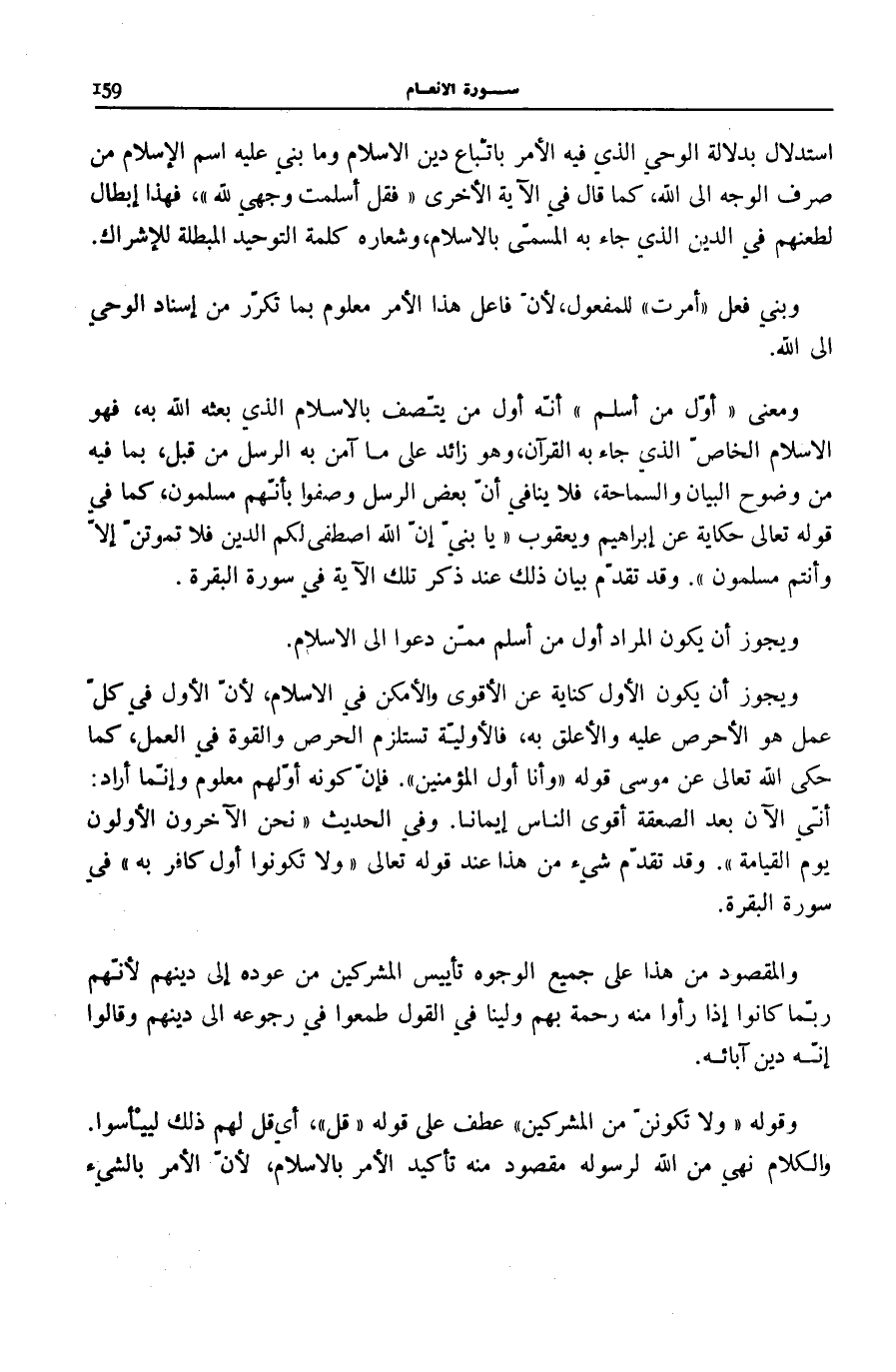 وَمَعْنَى أَوَّلَ مَنْ أَسْلَمَ أَنَّهُ أَوَّلُ مَنْ يَتَّصِفُ بِالْإِسْلَامِ الَّذِي بَعَثَهُ اللَّهُ بِهِ، فَهُوَ الْإِسْلَامُ الْخَاصُّ الَّذِي جَاءَ بِهِ الْقُرْآنُ، وَهُوَ زَائِدٌ عَلَى مَا آمَنَ بِهِ الرُّسُلُ مِنْ قَبْلُ، بِمَا فِيهِ مِنْ وُضُوحِ الْبَيَانِ وَالسَّمَاحَةِ، فَلَا يُنَافِي أَنَّ بَعْضَ الرُّسُلِ وُصِفُوا بِأَنَّهُمْ مُسْلِمُونَ، كَمَا فِي قَوْلِهِ تَعَالَى: