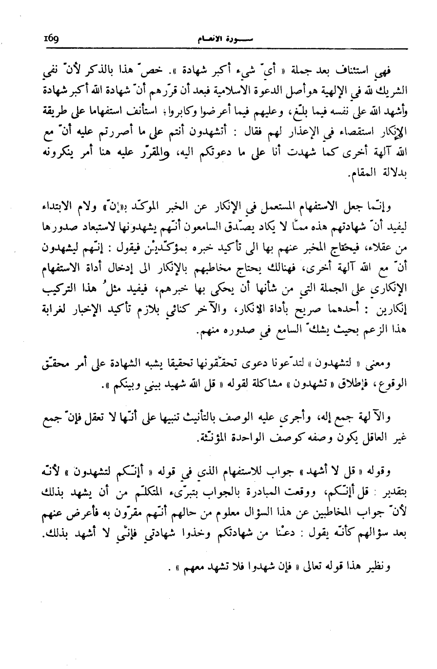 فَهِيَ اسْتِئْنَافٌ بَعْدَ جُمْلَةِ أَيُّ شَيْءٍ أَكْبَرُ شَهادَةً. خَصَّ هَذَا بِالذِّكْرِ لِأَنَّ نَفْيَ الشَّرِيكِ لِلَّهِ فِي الْإِلَهِيَّةِ هُوَ أَصْلُ الدَّعْوَةِ الْإِسْلَامِيَّةِ فَبَعْدَ أَنْ قَرَّرَهُمْ أَنَّ شَهَادَةَ اللَّهِ أَكْبَرُ شَهَادَةً وَأَشْهَدَ اللَّهَ عَلَى نَفْسِهِ فِيمَا بَلَّغَ، وَعَلَيْهِمْ فِيمَا أَعْرَضُوا وَكَابَرُوا اسْتَأْنَفَ اسْتِفْهَامًا عَلَى طَرِيقَةِ الْإِنْكَارِ اسْتِقْصَاءً فِي الْإِعْذَارِ لَهُمْ فَقَالَ: أَتَشْهَدُونَ أَنْتُمْ عَلَى مَا أَصْرَرْتُمْ عَلَيْهِ أَنَّ مَعَ اللَّهِ آلِهَةً أُخْرَى كَمَا شَهِدْتُ أَنَا عَلَى مَا دَعَوْتُكُمْ إِلَيْهِ، وَالْمُقَرَّرُ عَلَيْهِ هُنَا أَمْرٌ يُنْكِرُونَهُ بِدَلَالَةِ الْمَقَامِ.