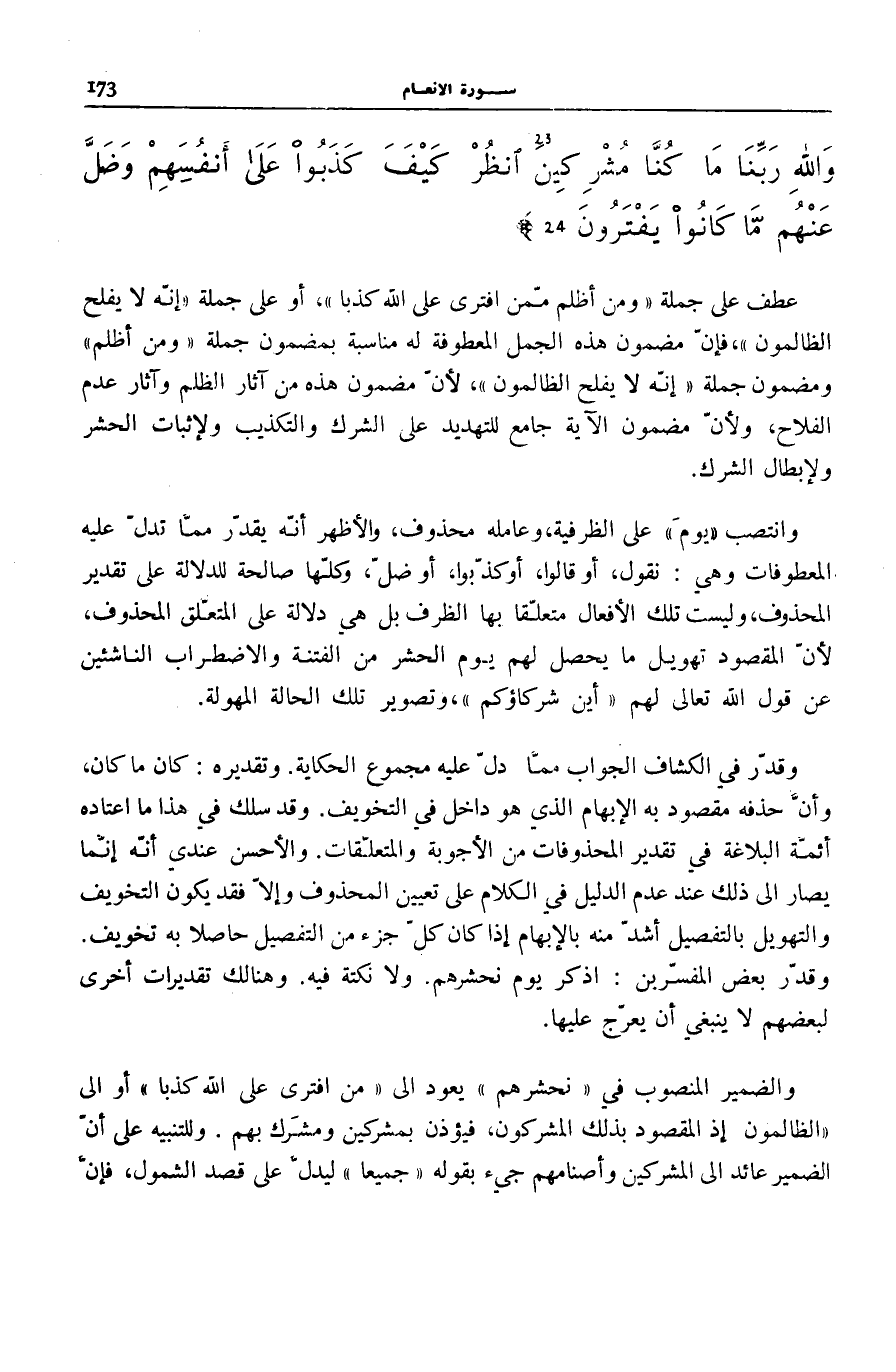 وَالضَّمِيرُ الْمَنْصُوبُ فِي نَحْشُرُهُمْ يَعُودُ إِلَى مِمَّنِ افْتَرى عَلَى اللَّهِ كَذِباً [الْأَنْعَام: 21] أَوْ إِلَى الظَّالِمُونَ [الْأَنْعَام: 21] إِذِ الْمَقْصُودُ بِذَلِكَ الْمُشْرِكُونَ، فَيُؤْذِنُ بِمُشْرِكِينَ وَمُشْرَكٍ بِهِمْ. وَلِلتَّنْبِيهِ عَلَى أَنَّ الضَّمِيرَ عَائِدٌ إِلَى الْمُشْرِكِينَ وَأَصْنَامِهِمْ جِيءَ بِقَوْلِهِ: جَمِيعاً لِيَدُلَّ عَلَى قَصْدِ الشُّمُولِ، فَإِنَّ