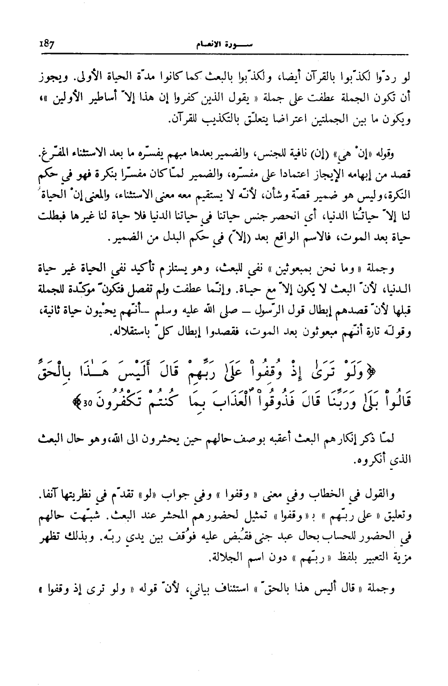 وَجُمْلَةُ: قالَ أَلَيْسَ هَذَا بِالْحَقِّ اسْتِئْنَافٌ بَيَانِيٌّ، لِأَنَّ قَوْلَهُ: وَلَوْ تَرى إِذْ وُقِفُوا