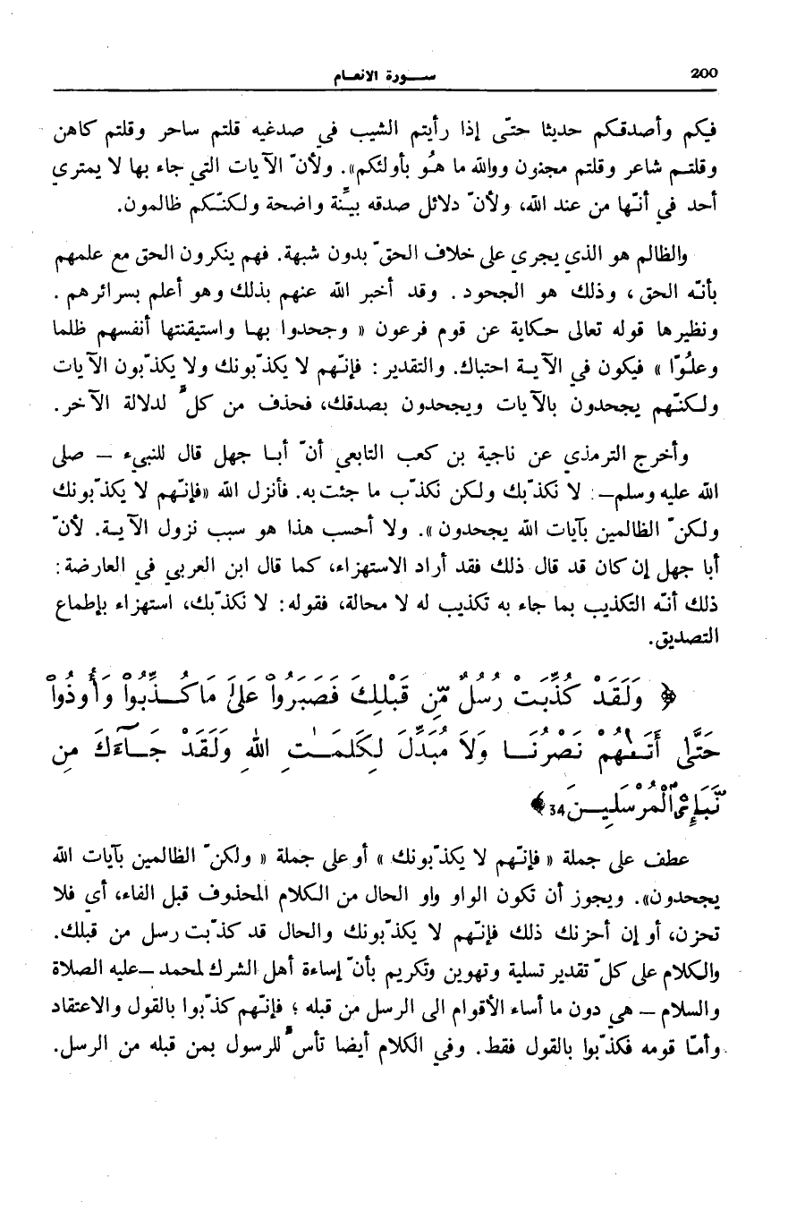 وَأَخْرَجَ التِّرْمِذِيُّ عَنْ نَاجِيَةَ بْنِ كَعْبٍ التَّابِعِيِّ أَنَّ أَبَا جَهْلٍ قَالَ لِلنَّبِيءِ صَلَّى اللهُ عَلَيْهِ وَسَلَّمَ: لَا نُكَذِّبُكَ وَلَكِنْ نُكَذِّبُ مَا جِئْتَ بِهِ. فَأَنْزَلَ اللَّهُ فَإِنَّهُمْ لَا يُكَذِّبُونَكَ وَلكِنَّ الظَّالِمِينَ بِآياتِ اللَّهِ يَجْحَدُونَ. وَلَا أَحْسَبُ هَذَا هُوَ سَبَبُ نُزُولِ الْآيَةِ. لِأَنَّ أَبَا جَهْلٍ إِنْ كَانَ قَدْ قَالَ ذَلِكَ فَقَدْ أَرَادَ الِاسْتِهْزَاءَ، كَمَا قَالَ ابْنُ الْعَرَبِيِّ فِي «الْعَارِضَةِ» : ذَلِكَ أَنَّهُ التَّكْذِيبُ بِمَا جَاءَ بِهِ تَكْذِيبٌ لَهُ لَا مَحَالَةَ، فَقَوْلُهُ: لَا نُكَذِّبُكَ، اسْتِهْزَاءٌ بإطماع التَّصْدِيق.
