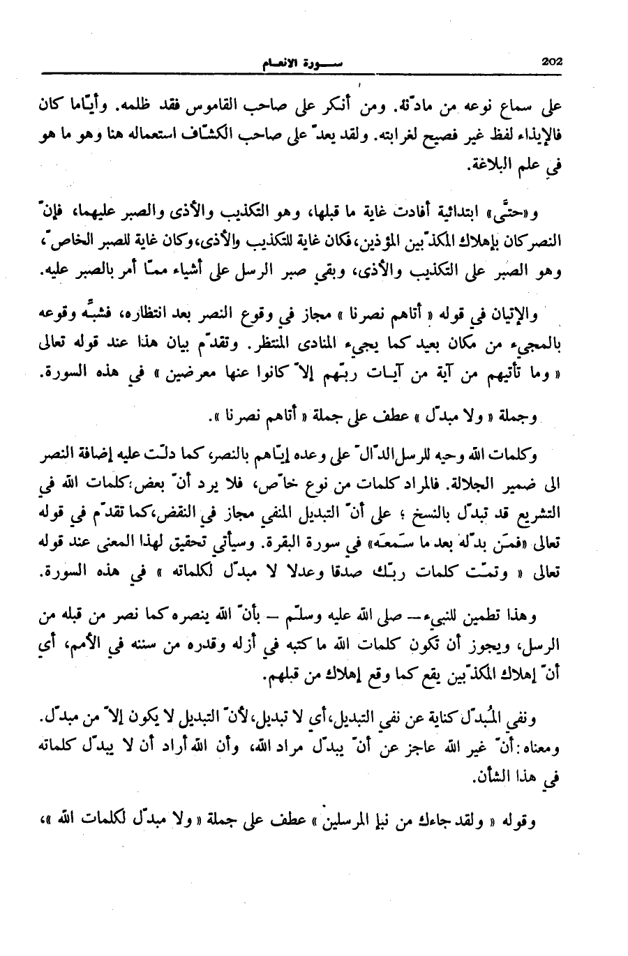 وَكَلِمَاتُ اللَّهِ وَحْيُهُ لِلرُّسُلِ الدَّالُّ عَلَى وَعْدِهِ إِيَّاهُمْ بِالنَّصْرِ، كَمَا دَلَّتْ عَلَيْهِ إِضَافَةُ النَّصْرِ إِلَى ضَمِيرِ الْجَلَالَةِ. فَالْمُرَادُ كَلِمَاتٌ مِنْ نَوْعٍ خَاصٍّ، فَلَا يَرِدُ أَنَّ بَعْضَ كَلِمَاتِ اللَّهِ فِي التَّشْرِيعِ قَدْ تُبَدَّلُ بِالنَّسْخِ عَلَى أَنَّ التَّبْدِيلَ الْمَنْفِيَّ مَجَازٌ فِي النَّقْضِ، كَمَا تَقَدَّمَ فِي قَوْلِهِ تَعَالَى: فَمَنْ بَدَّلَهُ بَعْدَ مَا سَمِعَهُ فِي سُورَةِ الْبَقَرَةِ [181] . وَسَيَأْتِي تَحْقِيقٌ لِهَذَا الْمَعْنَى عِنْدَ قَوْلِهِ تَعَالَى: وَتَمَّتْ كَلِمَةُ رَبِّكَ صِدْقاً وَعَدْلًا لَا مُبَدِّلَ لِكَلِماتِهِ فِي هَذِهِ السُّورَةِ [115] .