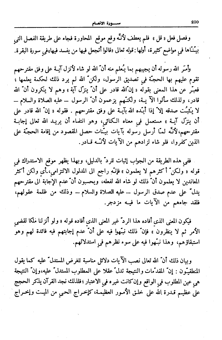 فَفِي هَذِهِ الطَّرِيقَةِ مِنَ الْجَوَابِ إِثْبَاتٌ لِلرَّدِّ بِالدَّلِيلِ، وَبِهَذَا يَظْهَرُ مَوْقِعُ الِاسْتِدْرَاكِ فِي قَوْلِهِ: وَلكِنَّ أَكْثَرَهُمْ لَا يَعْلَمُونَ فَإِنَّهُ رَاجِعٌ إِلَى الْمَدْلُولِ الِالْتِزَامِيِّ،- أَيْ وَلَكِنَّ أَكْثَرَ الْمُعَانِدِينَ لَا يَعْلَمُونَ أَنَّ ذَلِكَ لَوْ شَاءَ اللَّهُ لَفَعَلَهُ، وَيَحْسَبُونَ أَنَّ عَدَمَ الْإِجَابَةِ إِلَى مقترحهم يدلّ عَلَى عَدَمِ صِدْقِ الرَّسُولِ- عَلَيْهِ الصَّلَاةُ وَالسَّلَامُ- وَذَلِكَ مِنْ ظُلْمَةِ عُقُولِهِمْ، فَلَقَدْ جَاءَهُمْ مِنَ الْآيَاتِ مَا فِيهِ مُزْدَجَرٌ.