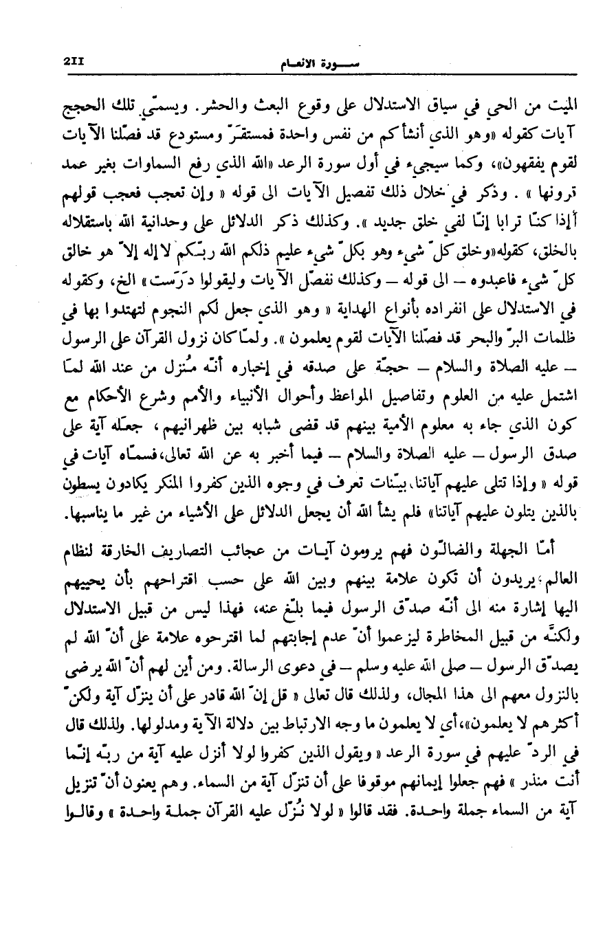 مِنَ الْحَيِّ فِي سِيَاقِ الِاسْتِدْلَالِ عَلَى وُقُوعِ الْبَعْثِ وَالْحَشْرِ. وَيُسَمِّي تِلْكَ الْحجَج آيَات كَقَوْلِهِ وَهُوَ الَّذِي أَنْشَأَكُمْ مِنْ نَفْسٍ واحِدَةٍ فَمُسْتَقَرٌّ وَمُسْتَوْدَعٌ قَدْ فَصَّلْنَا الْآياتِ لِقَوْمٍ يَفْقَهُونَ [الْأَنْعَام: 98] ، وَكَمَا سَيَجِيءُ فِي أَوَّلِ سُورَةِ الرَّعْدِ [2] اللَّهُ الَّذِي رَفَعَ السَّماواتِ بِغَيْرِ عَمَدٍ تَرَوْنَها. وَذَكَرَ فِي خِلَالِ ذَلِكَ تَفْصِيلَ الْآيَاتِ إِلَى قَوْلِهِ: وَإِنْ تَعْجَبْ فَعَجَبٌ قَوْلُهُمْ أَإِذا كُنَّا تُراباً أَإِنَّا لَفِي خَلْقٍ جَدِيدٍ [الرَّعْد: 5] . وَكَذَلِكَ ذِكْرُ الدَّلَائِلِ عَلَى وَحْدَانِيَّةِ اللَّهِ بِاسْتِقْلَالِهِ بِالْخَلْقِ، كَقَوْلِهِ: وَخَلَقَ كُلَّ شَيْءٍ وَهُوَ بِكُلِّ شَيْءٍ عَلِيمٌ ذلِكُمُ اللَّهُ رَبُّكُمْ لَا إِلهَ إِلَّا هُوَ خالِقُ كُلِّ شَيْءٍ فَاعْبُدُوهُ- إِلَى قَوْلِهِ- وَكَذلِكَ نُصَرِّفُ الْآياتِ وَلِيَقُولُوا دَرَسْتَ [الْأَنْعَام: 101- 105] إِلَخْ، وَكَقَوْلِهِ فِي الِاسْتِدْلَالِ عَلَى انْفِرَادِهِ بِأَنْوَاعِ الْهِدَايَةِ وَهُوَ الَّذِي جَعَلَ لَكُمُ النُّجُومَ لِتَهْتَدُوا بِها فِي ظُلُماتِ الْبَرِّ وَالْبَحْرِ قَدْ فَصَّلْنَا الْآياتِ لِقَوْمٍ يَعْلَمُونَ. وَلَمَّا كَانَ نُزُولُ الْقُرْآنِ عَلَى الرَّسُولِ- عَلَيْهِ الصَّلَاةُ وَالسَّلَامُ- حُجَّةً عَلَى صِدْقِهِ فِي إِخْبَارِهِ أَنَّهُ مُنَزَّلٌ مِنْ عِنْدِ اللَّهِ لِمَا اشْتَمَلَ عَلَيْهِ مِنَ الْعُلُومِ وَتَفَاصِيلِ الْمَوَاعِظِ وَأَحْوَالِ الْأَنْبِيَاءِ وَالْأُمَمِ وَشَرْعِ الْأَحْكَامِ مَعَ كَوْنِ الَّذِي جَاءَ بِهِ مَعْلُومَ الْأُمِّيَّةِ بَيْنَهُمْ قَدْ قَضَى شَبَابَهُ بَيْنَ ظَهْرَانَيْهِمْ، جَعَلَهُ آيَةً عَلَى صِدْقِ الرَّسُولِ- عَلَيْهِ الصَّلَاةُ وَالسَّلَامُ- فِيمَا أَخْبَرَ بِهِ عَنِ اللَّهِ تَعَالَى، فَسَمَّاهُ آيَاتٍ فِي قَوْلِهِ: وَإِذا تُتْلى عَلَيْهِمْ آياتُنا، بَيِّناتٍ تَعْرِفُ فِي وُجُوهِ الَّذِينَ كَفَرُوا الْمُنْكَرَ يَكادُونَ يَسْطُونَ بِالَّذِينَ يَتْلُونَ عَلَيْهِمْ آياتِنا [الْحَج: 72] فَلَمْ يَشَأِ اللَّهُ أَنْ يَجْعَلَ الدَّلَائِلَ عَلَى الْأَشْيَاءِ مِنْ غَيْرِ مَا يُنَاسِبُهَا.