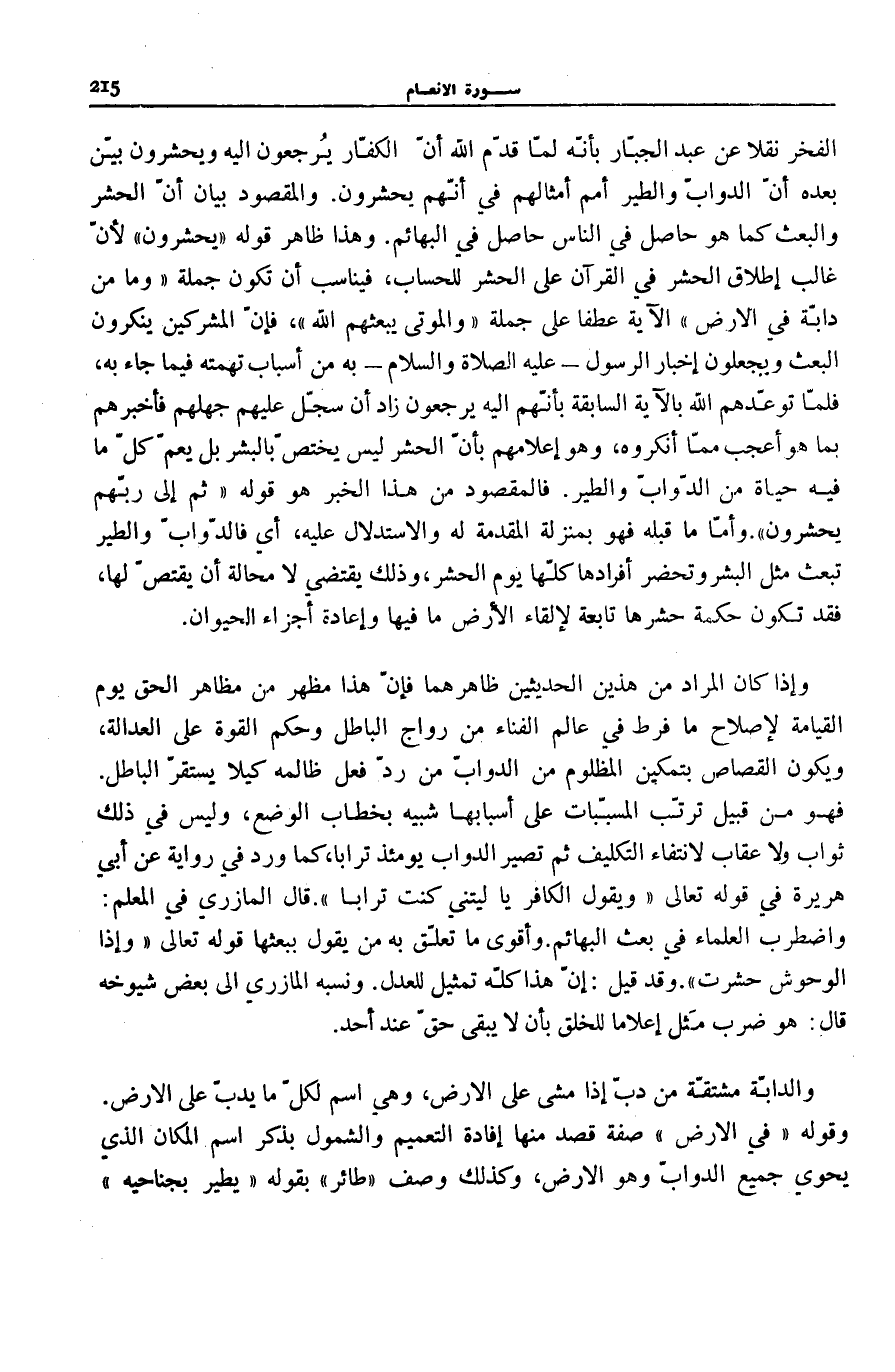 الْفَخْرُ نَقْلًا عَنْ عَبْدِ الْجَبَّارِ بِأَنَّهُ لَمَّا قَدَّمَ اللَّهُ أَنَّ الْكُفَّارَ يَرْجِعُونَ إِلَيْهِ وَيُحْشَرُونَ بَيَّنَ بَعْدَهُ أَنَّ الدَّوَابَّ وَالطَّيْرَ أُمَمٌ أَمْثَالُهُمْ فِي أَنَّهُمْ يُحْشَرُونَ. وَالْمَقْصُودُ بَيَانُ أَنَّ الْحَشْرَ وَالْبَعْثَ كَمَا هُوَ حَاصِلٌ فِي النَّاسِ حَاصِلٌ فِي الْبَهَائِمِ. وَهَذَا ظَاهِرُ قَوْلِهِ: يُحْشَرُونَ لِأَنَّ غَالِبَ إِطْلَاقِ الْحَشْرِ فِي الْقُرْآنِ عَلَى الْحَشْرِ لِلْحِسَابِ، فَيُنَاسِبُ أَنْ تَكُونَ جُمْلَةً: وَما مِنْ دَابَّةٍ فِي الْأَرْضِ الْآيَةَ عَطْفًا عَلَى جُمْلَةِ: