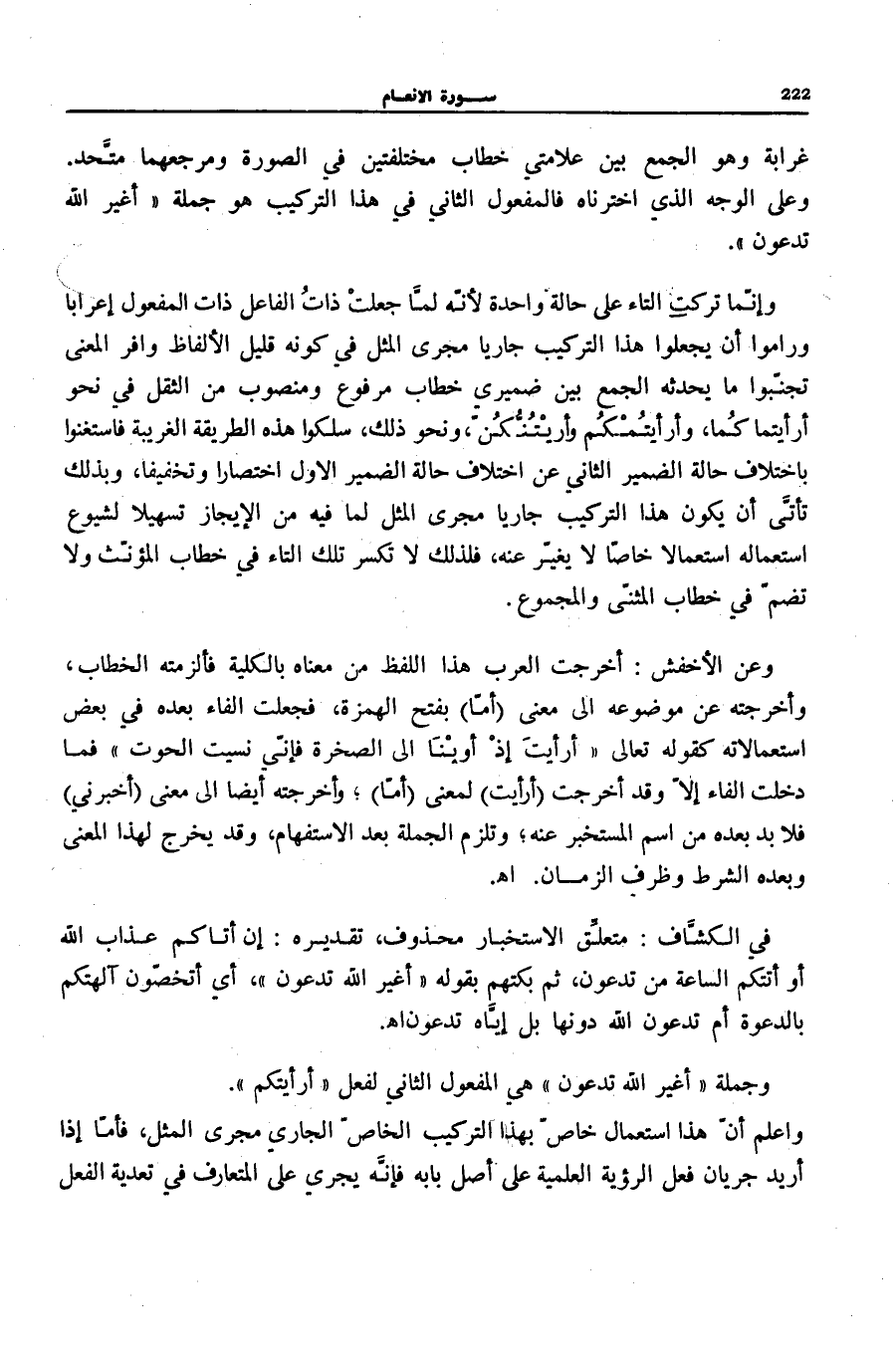 غَرَابَةً وَهُوَ الْجَمْعُ بَيْنَ عَلَامَتَيْ خِطَابٍ مُخْتَلِفَتَيْنِ فِي الصُّورَةِ وَمَرْجِعُهُمَا مُتَّحِدٌ. وَعَلَى الْوَجْهِ الَّذِي اخْتَرْنَاهُ فَالْمَفْعُولُ الثَّانِي فِي هَذَا التَّرْكِيبِ هُوَ جُمْلَةُ: أَغَيْرَ اللَّهِ تَدْعُونَ.