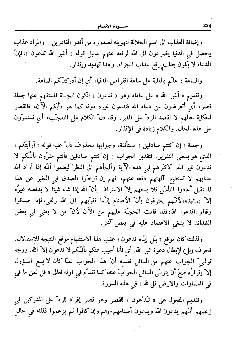 وَتَقْدِيمُ أَغَيْرَ اللَّهِ عَلَى عَامِلِهِ وَهُوَ تَدْعُونَ لِتَكُونَ الْجُمْلَةُ الْمُسْتَفْهَمُ عَنْهَا جُمْلَةَ قَصْرٍ، أَيْ أَتُعْرِضُونَ عَنْ دُعَاءِ اللَّهِ فَتَدْعُونَ غَيْرَهُ دُونَهُ كَمَا هُوَ دَأْبُكُمُ الْآنَ، فَالْقَصْرُ لِحِكَايَةِ حَالِهِمْ لَا لِقَصْدِ الرَّدِّ عَلَى الْغَيْرِ. وَقَدْ دَلَّ الْكَلَامُ عَلَى التَّعَجُّبِ، أَيْ تَسْتَمِرُّونَ عَلَى هَذِهِ الْحَالِ. وَالْكَلَامُ زِيَادَةٌ فِي الْإِنْذَار.