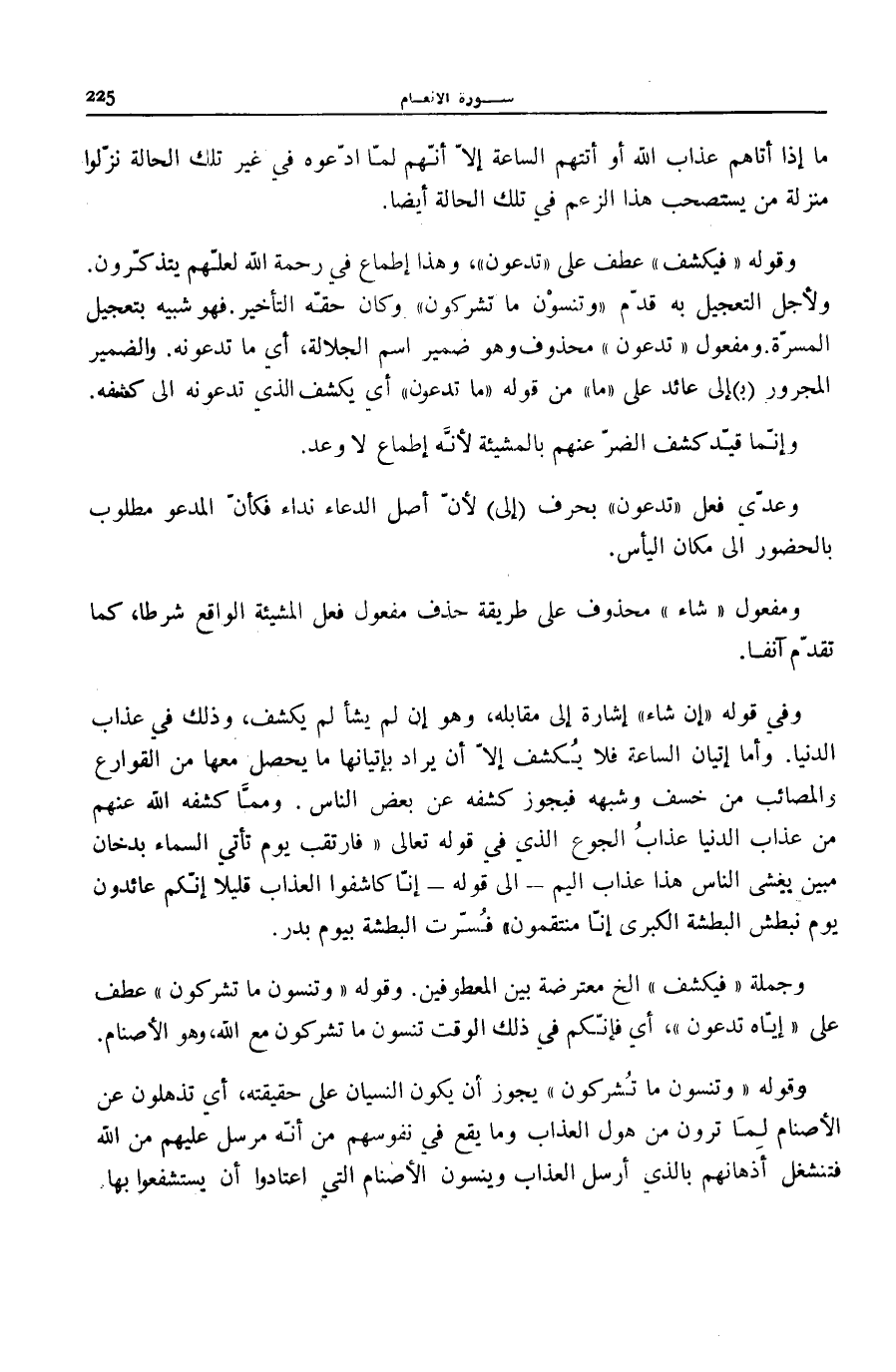 وَقَوْلُهُ: فَيَكْشِفُ عَطْفٌ عَلَى تَدْعُونَ، وَهَذَا إِطْمَاعٌ فِي رَحْمَةِ اللَّهِ لَعَلَّهُمْ يَتَذَكَّرُونَ. وَلِأَجْلِ التَّعْجِيلِ بِهِ قَدَّمَ وَتَنْسَوْنَ مَا تُشْرِكُونَ وَكَانَ حَقُّهُ التَّأْخِيرَ. فَهُوَ شَبِيهٌ بِتَعْجِيلِ الْمَسَرَّةِ. وَمَفْعُولُ: تَدْعُونَ مَحْذُوفٌ وَهُوَ ضَمِيرُ اسْمِ الْجَلَالَةِ، أَيْ مَا تَدْعُونَهُ.