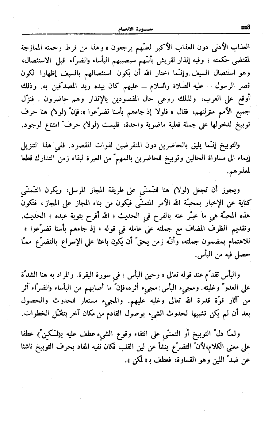 الِاسْتِئْصَالِ، وَهُوَ اسْتِئْصَالُ السَّيْفِ. وَإِنَّمَا اخْتَارَ اللَّهُ أَنْ يَكُونَ اسْتِئْصَالُهُمْ بِالسَّيْفِ إِظْهَارًا لِكَوْنِ نَصْرِ الرَّسُولِ- عَلَيْهِ الصَّلَاةُ وَالسَّلَامُ- عَلَيْهِمْ كَانَ بِيَدِهِ وَيَدِ الْمُصَدِّقِينَ بِهِ. وَذَلِكَ أَوْقَعُ عَلَى الْعَرَبِ، وَلِذَلِكَ رُوعِيَ حَالُ الْمَقْصُودِينَ بِالْإِنْذَارِ وَهُمْ حَاضِرُونَ. فَنَزَّلَ جَمِيعَ الْأُمَمِ مَنْزِلَتَهُمْ، فَقَالَ: فَلَوْلا إِذْ جاءَهُمْ بَأْسُنا تَضَرَّعُوا، فَإِنَّ (لَوْلَا) هُنَا حَرْفُ تَوْبِيخٍ لِدُخُولِهَا عَلَى جُمْلَةٍ فِعْلِيَّةٍ مَاضَوِيَّةٍ وَاحِدَةٍ، فَلَيْسَتْ (لَوْلَا) حَرْفَ امْتِنَاعٍ لِوُجُودٍ.