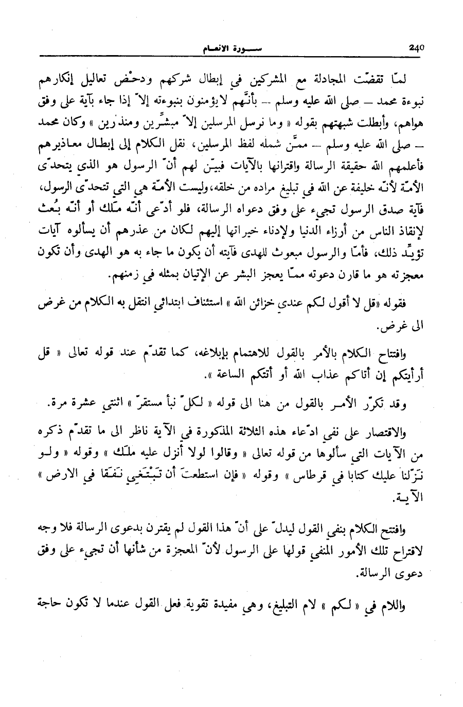 لَمَّا تَقَضَّتِ الْمُجَادَلَةُ مَعَ الْمُشْرِكِينَ فِي إِبْطَالِ شِرْكِهِمْ وَدَحْضِ تَعَالِيلِ إِنْكَارِهِمْ نُبُوءَةَ مُحَمَّدٍ صَلَّى اللهُ عَلَيْهِ وَسَلَّمَ بِأَنَّهُمْ لَا يُؤْمِنُونَ بِنُبُوءَتِهِ إِلَّا إِذَا جَاءَ بِآيَةٍ عَلَى وَفْقِ هَوَاهُمْ، وَأُبْطِلَتْ شُبْهَتُهُمْ بِقَوْلِهِ: وَما نُرْسِلُ الْمُرْسَلِينَ إِلَّا مُبَشِّرِينَ وَمُنْذِرِينَ [الْأَنْعَام: 48] وَكَانَ مُحَمَّدٌ صَلَّى اللهُ عَلَيْهِ وَسَلَّمَ مِمَّنْ شَمِلَهُ لَفْظُ الْمُرْسَلِينَ، نَقَلَ الْكَلَامَ إِلَى إِبْطَالِ مَعَاذِيرِهِمْ فَأَعْلَمَهُمُ اللَّهُ حَقِيقَةَ الرِّسَالَةِ وَاقْتِرَانِهَا بِالْآيَاتِ فَبَيَّنَ لَهُمْ أَنَّ الرَّسُولَ هُوَ الَّذِي يَتَحَدَّى الْأُمَّةَ لِأَنَّهُ خَلِيفَةٌ عَنِ اللَّهِ فِي تَبْلِيغِ مُرَادِهِ مِنْ خَلْقِهِ، وَلَيْسَتِ الْأُمَّةُ هِيَ الَّتِي تَتَحَدَّى الرَّسُولَ، فَآيَةُ صِدْقِ الرَّسُولِ تَجِيءُ عَلَى وَفْقِ دَعْوَاهُ الرِّسَالَةَ، فَلَوِ ادَّعَى أَنَّهُ مَلَكٌ أَوْ أَنَّهُ بُعِثَ لِإِنْقَاذِ النَّاسِ مِنْ أَرْزَاءِ الدُّنْيَا وَلِإِدْنَاءِ خَيْرَاتِهَا إِلَيْهِمْ لَكَانَ مِنْ عُذْرِهِمْ أَنْ يَسْأَلُوهُ آيَاتٍ تُؤَيِّدُ ذَلِكَ، فَأَمَّا وَالرَّسُولُ مَبْعُوثٌ لِلْهُدَى فَآيَتُهُ أَنْ يَكُونَ مَا جَاءَ بِهِ هُوَ الْهُدَى وَأَنْ تَكُونَ مُعْجِزَتُهُ هُوَ مَا قَارَنَ دَعْوَتَهُ مِمَّا يَعْجِزُ الْبَشَرُ عَنِ الْإِتْيَانِ بِمِثْلِهِ فِي زَمَنِهِمْ.