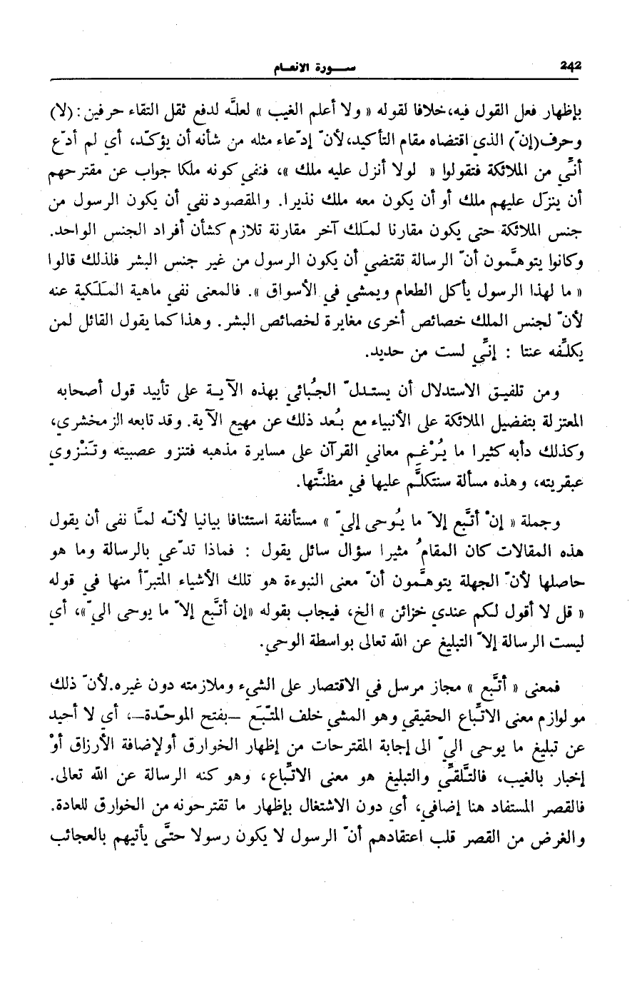وَمِنْ تَلْفِيقِ الِاسْتِدْلَالِ أَنْ يَسْتَدِلَّ الْجُبَّائِيُّ بِهَذِهِ الْآيَةِ عَلَى تَأْيِيدِ قَوْلِ أَصْحَابِهِ الْمُعْتَزِلَةِ بِتَفْضِيلِ الْمَلَائِكَةِ عَلَى الْأَنْبِيَاءِ مَعَ بُعْدِ ذَلِكَ عَنْ مَهْيَعِ الْآيَةِ. وَقَدْ تَابَعَهُ الزَّمَخْشَرِيُّ، وَكَذَلِكَ دَأْبُهُ كَثِيرًا مَا يُرْغِمُ مَعَانِيَ الْقُرْآنِ عَلَى مسايرة مذْهبه فتنزو عَصَبِيَّتُهُ وَتَنْزَوِي عَبْقَرِيَّتُهُ، وَهَذِهِ مَسْأَلَةٌ سَنَتَكَلَّمُ عَلَيْهَا فِي مَظِنَّتِهَا.