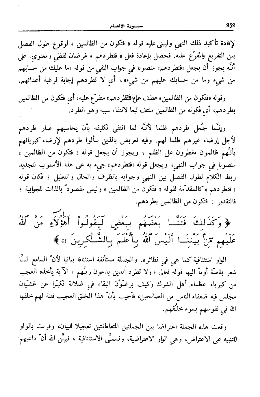 وَإِنَّمَا جَعَلَ طَرْدَهُمْ ظُلْمًا لِأَنَّهُ لَمَّا انْتَفَى تَكْلِيفُهُ بِأَنْ يُحَاسِبَهُمْ صَارَ طَرْدُهُمْ لِأَجْلٍ إِرْضَاءِ غَيْرِهِمْ ظُلْمًا لَهُمْ. وَفِيهِ تَعْرِيضٌ بِالَّذِينَ سَأَلُوا طَرْدَهُمْ لِإِرْضَاءِ كِبْرِيَائِهِمْ بأنّهم ظَالِمُونَ مفطرون عَلَى الظُّلْمِ وَيَجُوزُ أَنْ يُجْعَلَ قَوْلُهُ: فَتَكُونَ مِنَ الظَّالِمِينَ مَنْصُوبًا فِي جَوَابِ النَّهْيِ، وَيُجْعَلَ قَوْلُهُ فَتَطْرُدَهُمْ جِيءَ بِهِ عَلَى هَذَا الْأُسْلُوبِ لِتَجْدِيدِ رَبْطِ الْكَلَامِ لِطُولِ الْفَصْلِ بَيْنَ النَّهْيِ وَجَوَابِهِ بِالظَّرْفِ وَالْحَالِ وَالتَّعْلِيلِ فَكَانَ قَوْلُهُ فَتَطْرُدَهُمْ كَالْمُقَدَّمَةِ لِقَوْلِهِ فَتَكُونَ مِنَ الظَّالِمِينَ وَلَيْسَ مَقْصُود بِالذَّاتِ لِلْجَوَابِيَّةِ فَالتَّقْدِيرُ: فَتَكُونَ مِنَ الظَّالِمين بطردهم.
