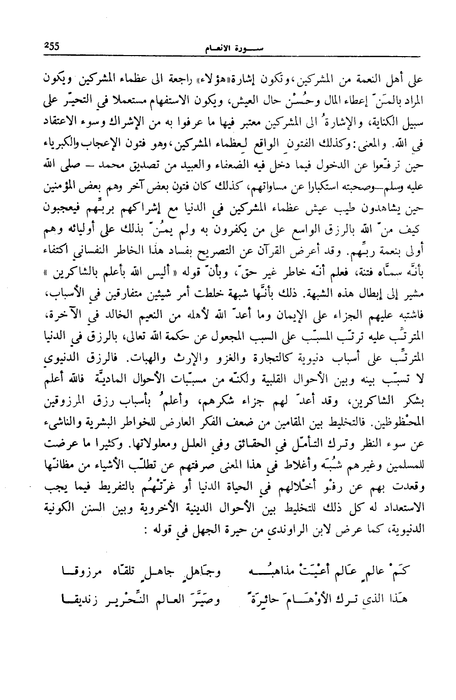 وَفِي الْعِلَلِ وَمَعْلُولَاتِهَا. وَكَثِيرًا مَا عَرَضَتْ لِلْمُسْلِمِينَ وَغَيْرِهِمْ شُبَهٌ وَأَغْلَاطٌ فِي هَذَا الْمَعْنَى صَرَفَتْهُمْ عَنْ تَطَلُّبِ الْأَشْيَاءِ مِنْ مَظَانِّهَا وَقَعَدَتْ بِهِمْ عَنْ رَفْوِ أَخَلَّالِهِمْ فِي الْحَيَاةِ الدُّنْيَا أَوْ غَرَّتْهُمْ بِالتَّفْرِيطِ فِيمَا يَجِبُ الِاسْتِعْدَادُ لَهُ كُلُّ ذَلِكَ لِلتَّخْلِيطِ بَيْنَ الْأَحْوَالِ الدِّينِيَّةِ الْأُخْرَوِيَّةِ وَبَيْنَ السُّنَنِ الْكَوْنِيَّةِ الدُّنْيَوِيَّةِ، كَمَا عَرَضَ لِابْنِ الرَّاوَنْدِيِّ مِنْ حَيْرَةِ الْجَهْلِ فِي قَوْلِهِ: