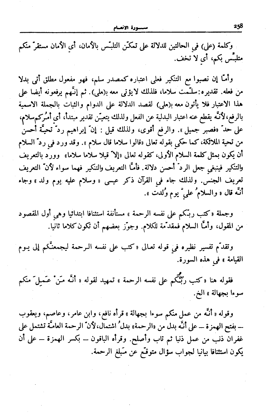 وَجُمْلَةُ كَتَبَ رَبُّكُمْ عَلى نَفْسِهِ الرَّحْمَةَ مُسْتَأْنَفَةٌ اسْتِئْنَافًا ابْتِدَائِيًّا وَهِيَ أَوَّلُ الْمَقْصُودِ مِنَ الْمَقُولِ، وَأَمَّا السَّلَامُ فَمُقَدِّمَةٌ لِلْكَلَامِ. وَجَوَّزَ بَعْضُهُمْ أَنْ تَكُونَ كَلَامًا ثَانِيًا. وَتَقَدَّمَ تَفْسِيرُ نَظِيرِهِ فِي قَوْلِهِ تَعَالَى: كَتَبَ عَلى نَفْسِهِ الرَّحْمَةَ لَيَجْمَعَنَّكُمْ إِلى يَوْمِ الْقِيامَةِ فِي هَذِهِ السُّورَةِ [12] . فَقَوْلُهُ هُنَا كَتَبَ رَبُّكُمْ عَلى نَفْسِهِ الرَّحْمَةَ تَمْهِيدٌ لِقَوْلِهِ: أَنَّهُ مَنْ عَمِلَ مِنْكُمْ سُوءاً بِجَهالَةٍ إِلَخ.