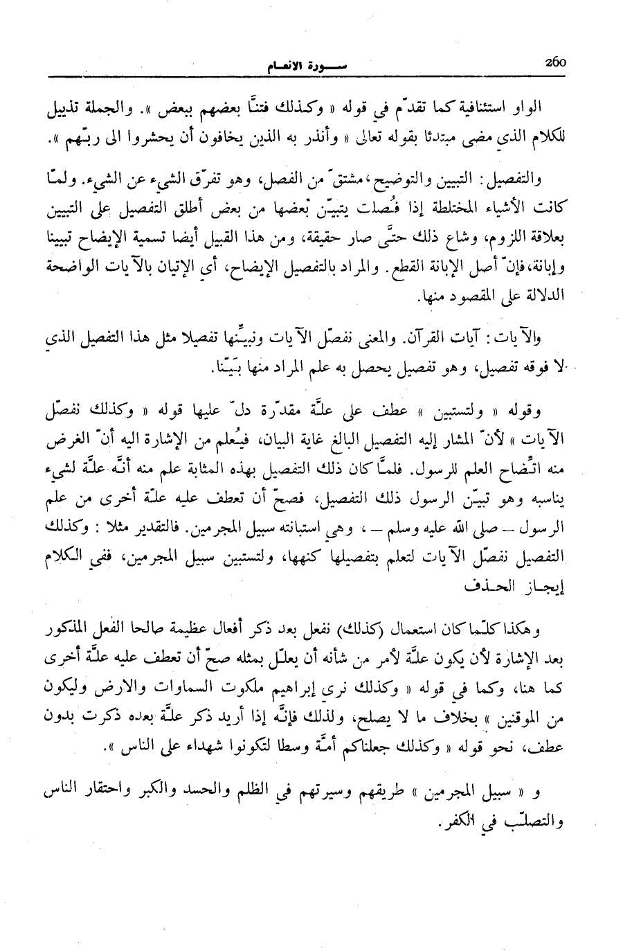 وَقَوْلُهُ: وَلِتَسْتَبِينَ عَطْفٌ عَلَى عِلَّةٍ مُقَدَّرَةٍ دَلَّ عَلَيْهَا قَوْلُهُ: وَكَذلِكَ نُفَصِّلُ الْآياتِ لِأَنَّ الْمُشَارَ إِلَيْهِ التَّفْصِيلُ الْبَالِغُ غَايَةَ الْبَيَانِ، فَيُعْلَمُ مِنَ الْإِشَارَةِ إِلَيْهِ أَنَّ الْغَرَضَ مِنْهُ اتِّضَاحُ الْعِلْمِ لِلرَّسُولِ. فَلَمَّا كَانَ ذَلِكَ التَّفْصِيلُ بِهَذِهِ الْمَثَابَةِ عُلِمَ مِنْهُ أَنَّهُ عِلَّةٌ لِشَيْءٍ يُنَاسِبُهُ وَهُوَ تَبَيُّنُ الرَّسُولِ ذَلِكَ التَّفْصِيلَ، فَصَحَّ أَنْ تُعْطَفَ عَلَيْهِ عِلَّةٌ أُخْرَى مِنْ عِلْمِ الرَّسُولِ صَلَّى اللهُ عَلَيْهِ وَسَلَّمَ، وَهِيَ اسْتِبَانَتُهُ سَبِيلَ الْمُجْرِمِينَ. فَالتَّقْدِيرُ مَثَلًا: وَكَذَلِكَ التَّفْصِيلُ نُفَصِّلُ الْآيَاتِ لِتَعْلَمَ بِتَفْصِيلِهَا كُنْهَهَا، وَلِتَسْتَبِينَ سَبِيلَ الْمُجْرِمِينَ، فَفِي الْكَلَامِ إِيجَازُ الْحَذْفِ.