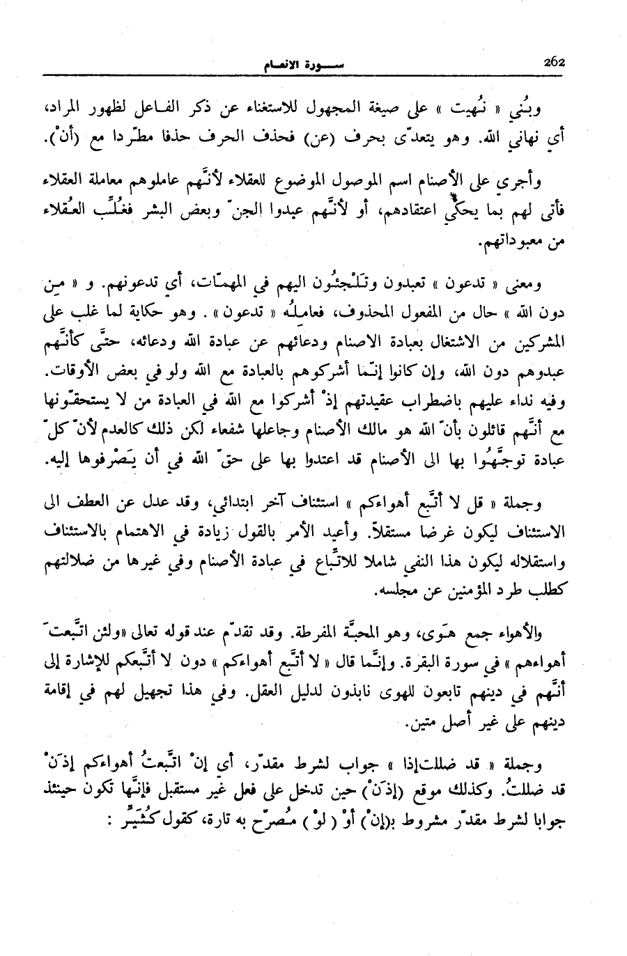 وَجُمْلَةُ قُلْ لَا أَتَّبِعُ أَهْواءَكُمْ اسْتِئْنَافٌ آخَرُ ابْتِدَائِيٌّ، وَقَدْ عُدِلَ عَنِ الْعَطْفِ إِلَى الِاسْتِئْنَافِ لِيَكُونَ غَرَضًا مُسْتَقِلًّا. وَأُعِيدَ الْأَمْرُ بِالْقَوْلِ زِيَادَةً فِي الِاهْتِمَامِ بِالِاسْتِئْنَافِ وَاسْتِقْلَالِهِ لِيَكُونَ هَذَا النَّفْيُ شَامِلًا لِلِاتِّبَاعِ فِي عِبَادَةِ الْأَصْنَامِ وَفِي غَيْرِهَا مِنْ ضَلَالَتِهِمْ