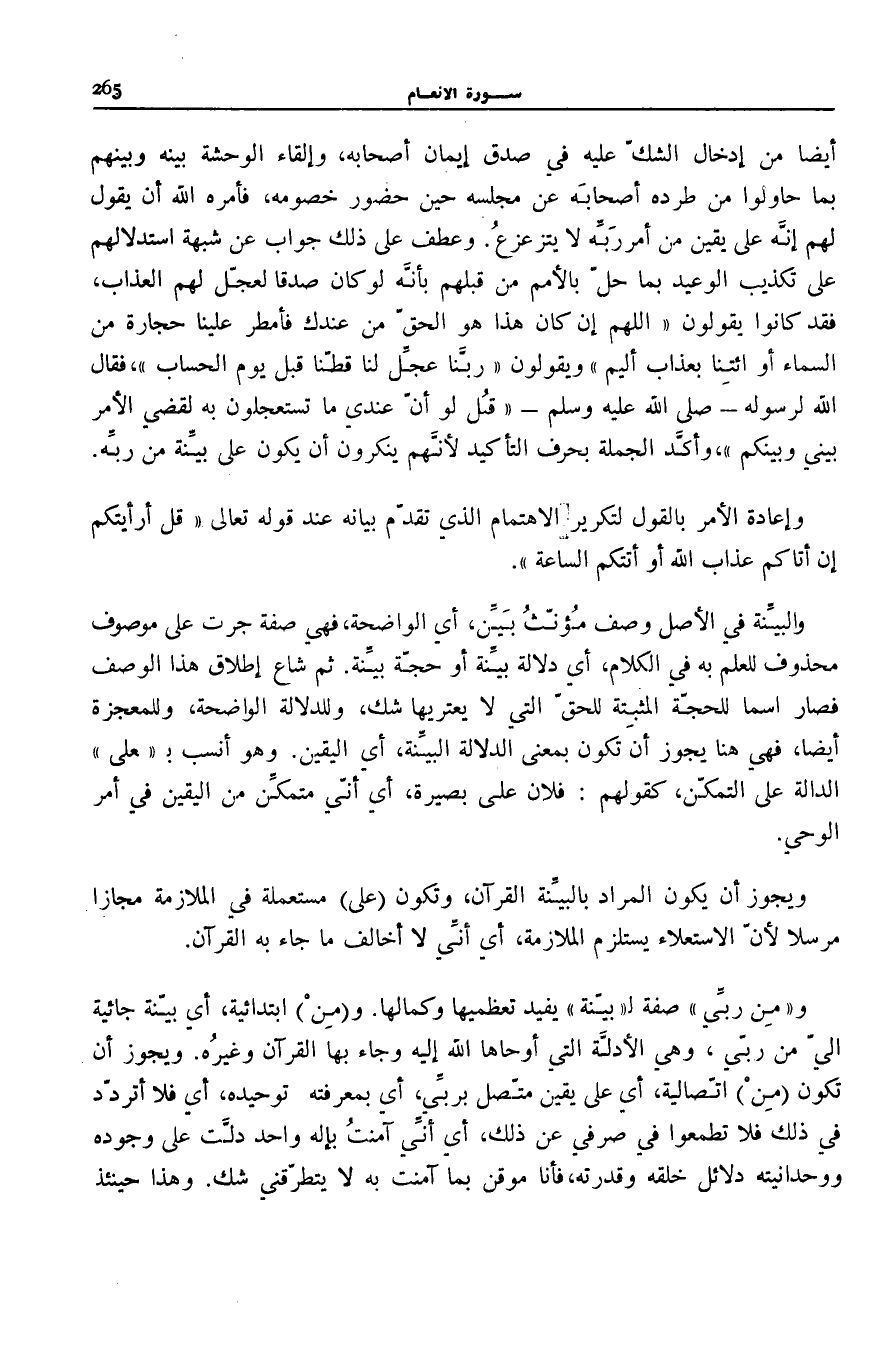 رَبَّنا عَجِّلْ لَنا قِطَّنا قَبْلَ يَوْمِ الْحِسابِ [ص: 16] ، فَقَالَ اللَّهُ لِرَسُولِهِ صَلَّى اللهُ عَلَيْهِ وَسَلَّمَ: قُلْ لَوْ أَنَّ عِنْدِي مَا تَسْتَعْجِلُونَ بِهِ لَقُضِيَ الْأَمْرُ بَيْنِي وَبَيْنَكُمْ [الْأَنْعَام: 58] ، وَأَكَّدَ الْجُمْلَةَ بِحَرْفِ التَّأْكِيدِ لِأَنَّهُمْ يُنْكِرُونَ أَنْ يَكُونَ عَلَى بَيِّنَةٍ مِنْ رَبِّهِ.