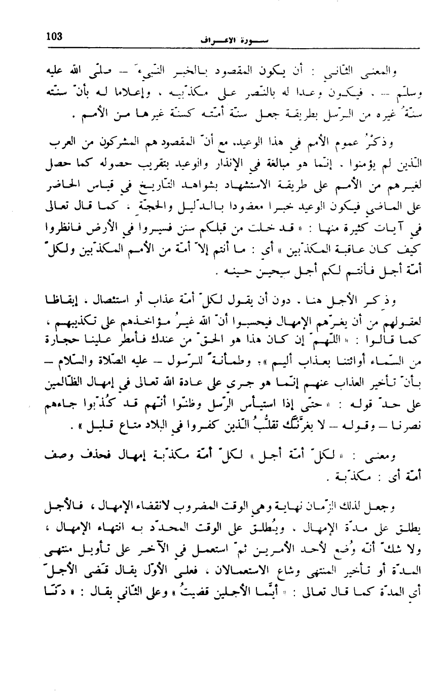 وَمَعْنَى: لِكُلِّ أُمَّةٍ أَجَلٌ لِكُلِّ أُمَّةٍ مُكَذِّبَةٍ إِمْهَالٌ فَحُذِفَ وَصْفُ أُمَّةٍ أَيْ: مُكَذِّبَةٍ.