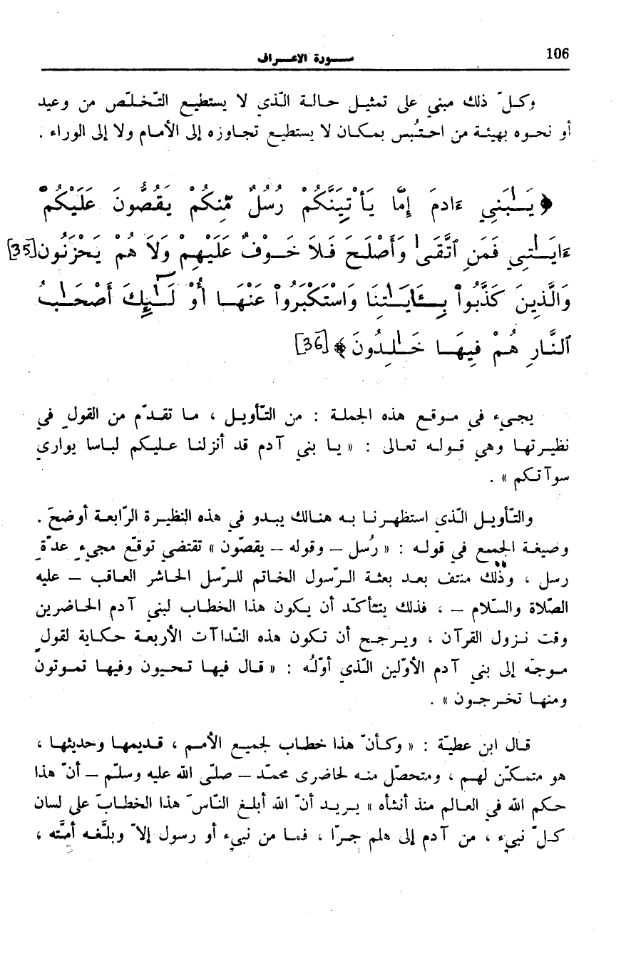 وَالتَّأْوِيلُ الَّذِي اسْتَظْهَرْنَا بِهِ هُنَالِكَ يَبْدُو فِي هَذِهِ النَّظِيرَةِ الرَّابِعَةِ أَوْضَحَ. وَصِيغَةُ الْجَمْعِ فِي قَوْلِهِ: رُسُلٌ- وَقَوْلِهِ- يَقُصُّونَ تَقْتَضِي تَوَقُّعَ مَجِيءِ عِدَّةِ رُسُلٍ، وَذَلِكَ مُنْتَفٍ بَعْدَ بِعْثَةِ الرَّسُولِ الْخَاتِمِ لِلرُّسُلِ الْحَاشِرِ الْعَاقِبِ عَلَيْهِ الصَّلَاةُ وَالسَّلَامُ، فَذَلِكَ يَتَأَكَّدُ أَنْ يَكُونَ هَذَا الْخِطَابُ لِبَنِي آدَمَ الْحَاضِرِينَ وَقْتَ نُزُولِ الْقُرْآنِ، وَيُرَجِّحُ أَنْ تكون هَذِه النّداآت الْأَرْبَعَةُ حِكَايَةً لِقَوْلٍ مُوَجَّهٍ إِلَى بَنِي آدَمَ الْأَوَّلِينَ الَّذِي أَوَّلُهُ: قالَ فِيها تَحْيَوْنَ وَفِيها تَمُوتُونَ وَمِنْها تُخْرَجُونَ [الْأَعْرَاف: 25] .