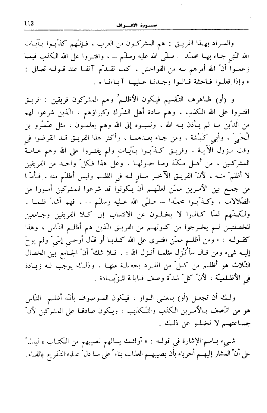 وَ (أَوْ) ظَاهِرُهَا التَّقْسِيمُ فَيَكُونُ الْأَظْلَمُ وَهُمُ الْمُشْرِكُونَ فَرِيقَيْنِ: فَرِيقٌ افْتَرَوْا عَلَى اللَّهِ الْكَذِبَ، وَهُمْ سَادَةُ أَهْلِ الشِّرْكِ وَكُبَرَاؤُهُمْ، الَّذِينَ شَرَعُوا لَهُمْ مِنَ الدِّينِ مَا لَمْ يَأْذَنْ بِهِ اللَّهُ، وَنَسَبُوهُ إِلَى اللَّهِ وَهُمْ يَعْلَمُونَ، مِثْلُ عَمْرِو بْنِ لُحَيٍّ، وَأَبِي كَبْشَةَ، وَمَنْ جَاءَ بَعْدَهُمَا، وَأَكْثَرُ هَذَا الْفَرِيقِ قَدِ انْقَرَضُوا فِي وَقْتِ نُزُولِ الْآيَةِ، وَفَرِيقٌ كَذَّبُوا بِآيَاتٍ وَلَمْ يَفْتَرُوا عَلَى اللَّهِ وَهُمْ عَامَّةُ الْمُشْرِكِينَ، مِنْ أَهْلِ مَكَّةَ وَمَا حَوْلَهَا، وَعَلَى هَذَا فَكُلُّ وَاحِدٍ مِنَ الْفَرِيقَيْنِ لَا أَظْلَمَ مِنْهُ، لِأَنَّ الْفَرِيقَ الْآخَرَ مُسَاوٍ لَهُ فِي الظُّلْمِ وَلَيْسَ أَظْلَمَ مِنْهُ، فَأَمَّا مَنْ جَمَعَ بَيْنَ الْأَمْرَيْنِ مِمَّنْ لَعَلَّهُمْ أَنْ يَكُونُوا قَدْ شَرَعُوا لِلْمُشْرِكِينَ أُمُورًا مِنَ الضَّلَالَاتِ، وكذّبوا محمّدا صَلَّى اللهُ عَلَيْهِ وَسَلَّمَ، فَهُمْ أَشَدُّ ظُلْمًا، وَلَكِنَّهُمْ لَمَّا كَانُوا لَا يَخْلُونَ عَنِ الِانْتِسَابِ إِلَى كِلَا الْفَرِيقَيْنِ وَجَامِعِينَ لِلْخَصْلَتَيْنِ لَمْ يَخْرُجُوا مِنْ كَوْنِهِمْ مِنَ الْفَرِيقِ الَّذِينَ هُمْ أَظْلَمُ النَّاسِ، وَهَذَا كَقَوْلِهِ: وَمَنْ أَظْلَمُ مِمَّنِ افْتَرى عَلَى اللَّهِ كَذِباً أَوْ قالَ أُوحِيَ إِلَيَّ وَلَمْ يُوحَ إِلَيْهِ شَيْءٌ وَمَنْ قالَ سَأُنْزِلُ مِثْلَ مَا أَنْزَلَ اللَّهُ [الْأَنْعَام: 93] ، فَلَا شَكَّ أَنَّ الْجَامِعَ بَيْنَ الْخِصَالِ الثَّلَاثِ هُوَ أَظْلَمُ مِنْ كُلِّ مَنِ انْفَرَدَ بِخَصْلَةٍ مِنْهَا، وَذَلِكَ يُوجِبُ لَهُ زِيَادَةً فِي الْأَظْلَمِيَّةِ، لِأَنَّ كُلَّ شِدَّةِ وَصْفٍ قَابِلَةٌ لِلزِّيَادَةِ.