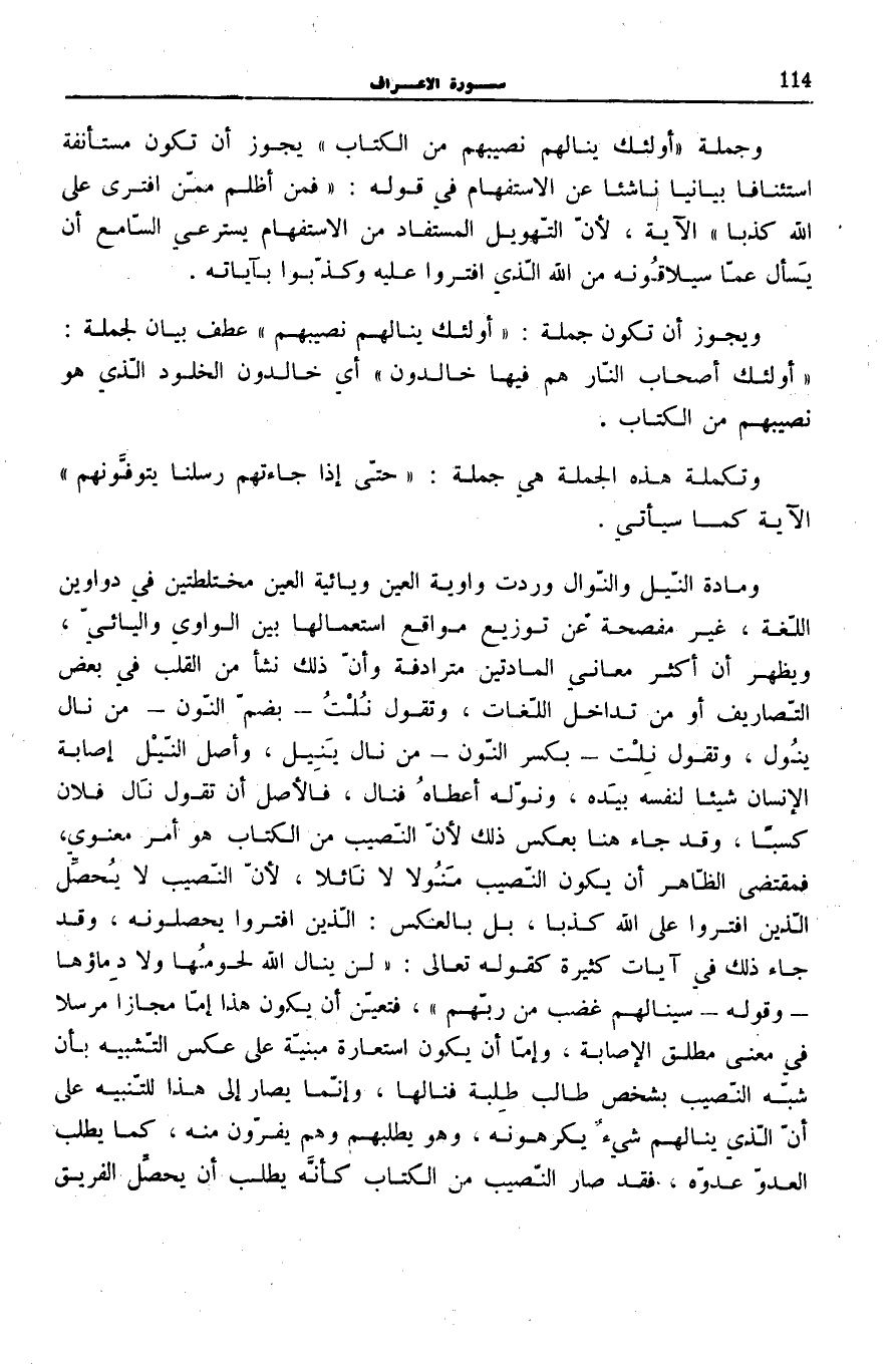 وَمَادَّةُ النَّيْلِ وَالنَّوَالِ وَرَدَتْ وَاوِيَّةَ الْعَيْنِ وَيَائِيَّةَ الْعَيْنِ مُخْتَلِطَتَيْنِ فِي دَوَاوِينِ اللُّغَةِ، غَيْرَ مُفْصِحَةٍ عَنْ تَوْزِيعِ مَوَاقِعِ اسْتِعْمَالِهَا بَيْنَ الْوَاوِيِّ وَالْيَائِيِّ، وَيَظْهَرُ أَنَّ أَكْثَرَ مَعَانِي الْمَادَّتَيْنِ مُتَرَادِفَةٌ وَأَنَّ ذَلِكَ نَشَأَ مِنَ الْقَلْبِ فِي بَعْضِ التَّصَارِيفِ أَوْ مِنْ تَدَاخُلِ اللُّغَاتِ، وَتَقُولُ نُلْتُ- بِضَمِّ النُّونِ- مِنْ نَالَ يَنُولُ، وَتَقُولُ نِلْتُ- بِكَسْرِ النُّونِ- مِنْ نَالَ يُنِيلُ، وَأَصْلُ النَّيْلِ إِصَابَةُ الْإِنْسَانِ شَيْئًا لِنَفْسِهِ بِيَدِهِ، وَنَوَّلَهُ أَعْطَاهُ فَنَالَ، فَالْأَصْلُ أَنْ تَقُولَ نَالَ فُلَانٌ كَسْبًا، وَقَدْ جَاءَ هُنَا بِعَكْسِ ذَلِكَ لِأَنَّ النَّصِيبَ مِنَ الْكِتَابِ هُوَ أَمْرٌ مَعْنَوِيٌّ، فَمُقْتَضَى الظَّاهِرِ أَنْ يَكُونَ النَّصِيبُ مُنَوَّلًا لَا نَائِلًا، لِأَنَّ النَّصِيبَ لَا يُحَصِّلُ الَّذِينَ افْتَرَوْا عَلَى اللَّهِ كَذِبًا، بَلْ بِالْعَكْسِ: