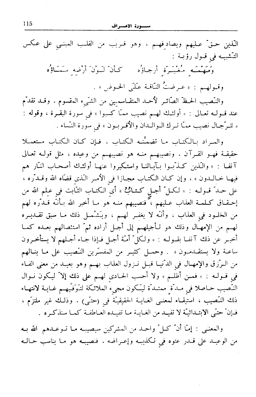 الَّذِينَ حَقَّ عَلَيْهِمْ وَيُصَادِفَهُمْ، وَهُوَ قَرِيبٌ مِنَ الْقَلْبِ الْمَبْنِيِّ عَلَى عَكْسِ التَّشْبِيهِ فِي قَوْلِ رُؤْبَةَ:
