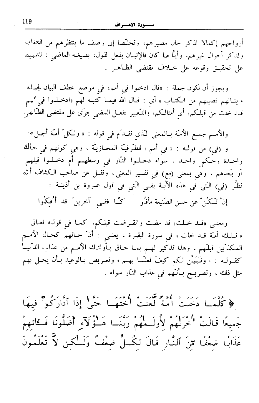 وَيَجُوزُ أَنْ تَكُونَ جُمْلَةُ: قالَ ادْخُلُوا فِي أُمَمٍ فِي مَوْضِعِ عَطْفِ الْبَيَانِ لِجُمْلَةِ يَنالُهُمْ نَصِيبُهُمْ مِنَ الْكِتابِ أَيْ: قَالَ اللَّهُ فِيمَا كَتَبَهُ لَهُمُ ادْخُلُوا فِي أُمَمٍ قَدْ خَلَتْ مِنْ قَبْلِكُمْ [الْأَعْرَاف: 34] أَيْ أَمْثَالِكُمْ، وَالتَّعْبِيرُ بِفِعْلِ الْمُضِيِّ جَرَى عَلَى مُقْتَضَى الظَّاهِرِ.