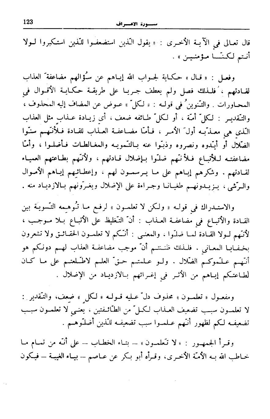 وَالِاسْتِدْرَاكُ فِي قَوْلِهِ: وَلكِنْ لَا تَعْلَمُونَ لِرَفْعِ مَا تُوهِمُهُ التَّسْوِيَةُ بَيْنَ الْقَادَةِ وَالْأَتْبَاعِ فِي مُضَاعَفَةِ الْعَذَابِ: أَنَّ التَّغْلِيظَ عَلَى الْأَتْبَاعِ بِلَا مُوجِبٍ، لِأَنَّهُمْ لَوْلَا الْقَادَةُ لَمَا ضَلُّوا، وَالْمَعْنَى: أَنَّكُمْ لَا تَعْلَمُونَ الْحَقَائِقَ وَلَا تَشْعُرُونَ بِخَفَايَا الْمَعَانِي، فَلِذَلِكَ ظَنَنْتُمْ أَنَّ مُوجِبَ مُضَاعَفَةِ الْعَذَابِ لَهُمْ دُونَكُمْ هُوَ أَنَّهُمْ عَلَّمُوكُمُ الضَّلَالَ، وَلَوْ عَلِمْتُمْ حَقَّ الْعِلْمِ لَاطَّلَعْتُمْ عَلَى مَا كَانَ لِطَاعَتِكُمْ إِيَّاهُمْ مِنَ الْأَثَرِ فِي إِغْرَائِهِمْ بِالِازْدِيَادِ مِنَ الْإِضْلَالِ. وَمَفْعُولُ تَعْلَمُونَ مَحْذُوفٌ دَلَّ عَلَيْهِ قَوْلُهُ: لِكُلٍّ ضِعْفٌ، وَالتَّقْدِيرُ: لَا تَعْلَمُونَ سَبَبَ تَضْعِيفِ الْعَذَابِ لِكُلٍّ مِنَ الطَّائِفَتَيْنِ، يَعْنِي لَا تَعْلَمُونَ سَبَبَ تَضْعِيفِهِ لَكُمْ لِظُهُورِ أَنَّهُمْ عَلِمُوا سَبَبَ تَضْعِيفِهِ لِلَّذِينَ أَضَلُّوهُمْ.