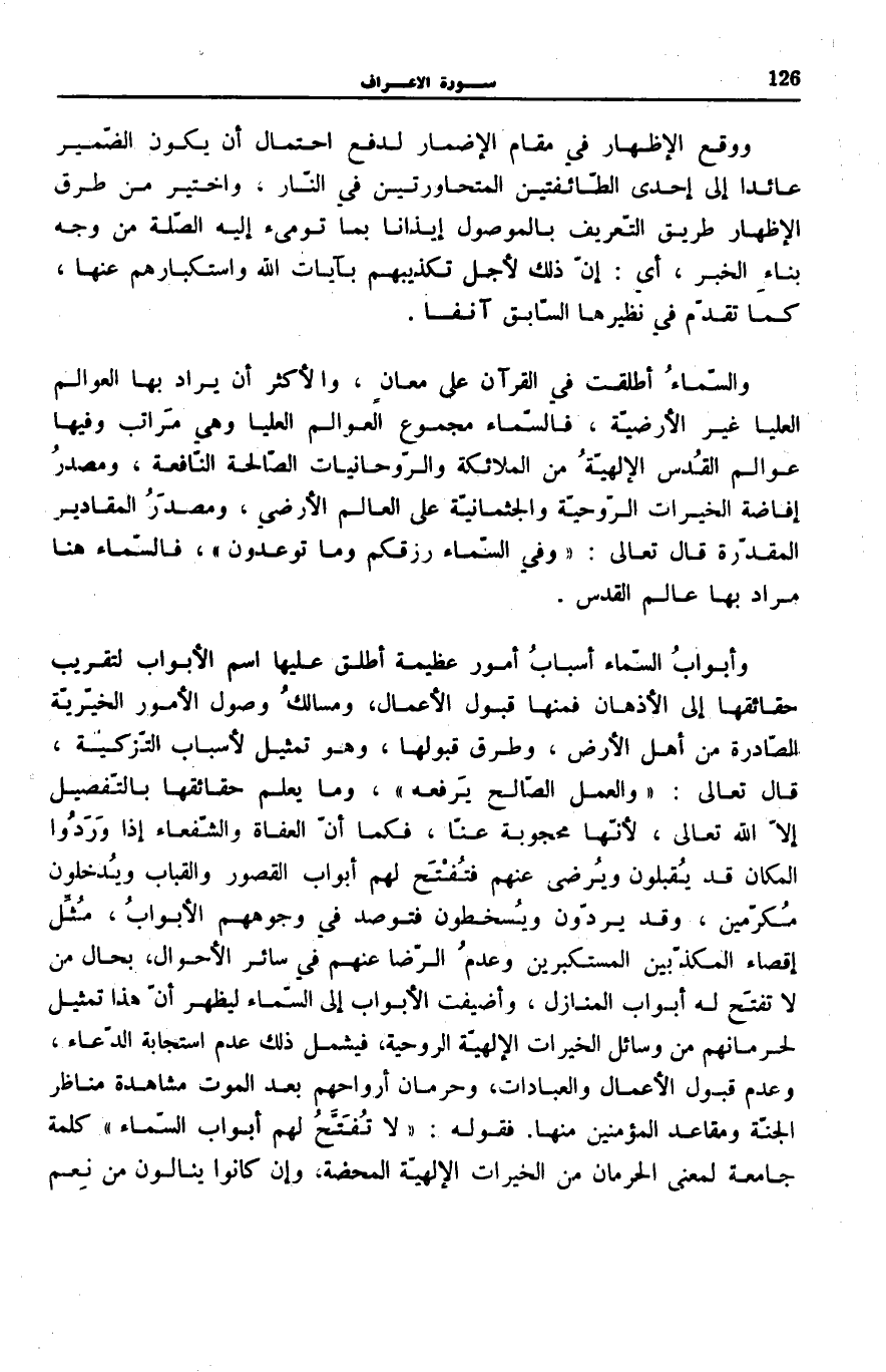 10] ، وَمَا يَعْلَمُ حَقَائِقَهَا بِالتَّفْصِيلِ إِلَّا اللَّهُ تَعَالَى، لِأَنَّهَا مَحْجُوبَةٌ عَنَّا، فَكَمَا أَنَّ الْعُفَاةَ وَالشُّفَعَاءَ إِذَا وَرَدُوا الْمَكَانَ قَدْ يُقْبَلُونَ وَيُرْضَى عَنْهُمْ فَتُفَتَّحُ لَهُمْ أَبْوَابُ الْقُصُورِ وَالْقِبَابِ وَيَدْخُلُونَ مُكَرَّمِينَ، وَقَدْ يُرَدُّونَ وَيُسْخَطُونَ فَتُوصَدُ فِي وُجُوهِهِمُ الْأَبْوَابُ، مَثَّلَ إِقْصَاءَ الْمُكَذِّبِينَ الْمُسْتَكْبِرِينَ وَعَدَمَ الرِّضَا عَنْهُمْ فِي سَائِرِ الْأَحْوَالِ، بِحَالِ مَنْ لَا تُفَتَّحُ لَهُ أَبْوَابُ الْمَنَازِلِ، وَأُضِيفَتِ الْأَبْوَابُ إِلَى السَّمَاءِ لِيَظْهَرَ أَنَّ هَذَا تَمْثِيلٌ لِحِرْمَانِهِمْ مِنْ وَسَائِلِ الْخَيْرَاتِ الْإِلَهِيَّةِ الرُّوحِيَّةِ، فَيَشْمَلُ ذَلِكَ عَدَمَ اسْتِجَابَةِ الدُّعَاءِ، وَعَدَمَ قَبُولِ الْأَعْمَالِ وَالْعِبَادَاتِ، وَحِرْمَانَ أَرْوَاحِهِمْ بَعْدَ الْمَوْتِ مُشَاهَدَةَ مَنَاظِرِ الْجَنَّةِ وَمَقَاعِدِ الْمُؤْمِنِينَ مِنْهَا، فَقَوله: لَا نفتح لَهُمْ أَبْوابُ السَّماءِ كَلِمَةٌ جَامِعَةٌ لِمَعْنَى الْحِرْمَانِ مِنَ الْخَيْرَاتِ الْإِلَهِيَّةِ الْمَحْضَةِ، وَإِنْ كَانُوا يَنَالُونَ مِنْ نِعَمِ