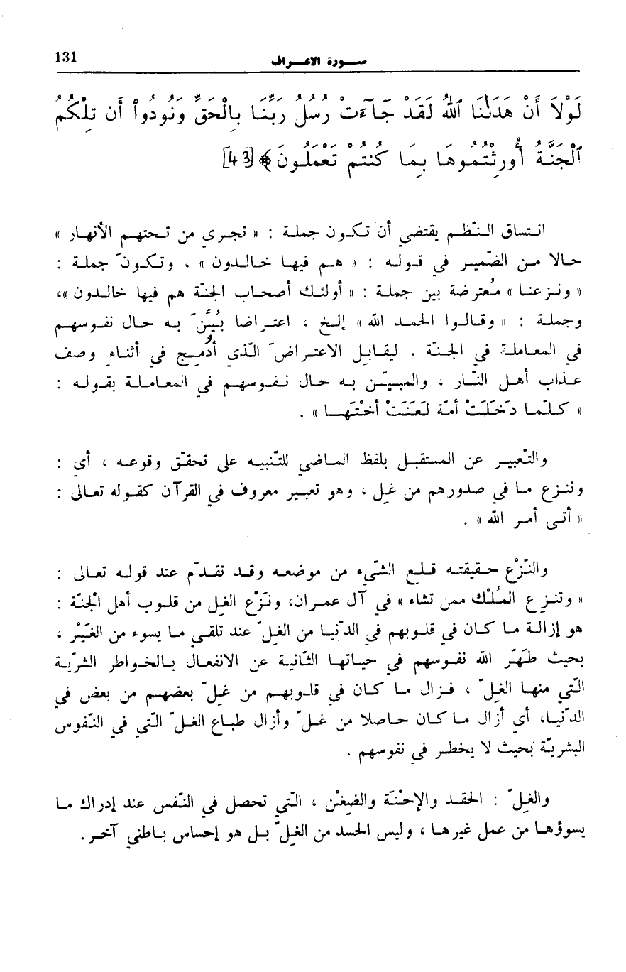اتِسَاقُ النَّظْمِ يَقْتَضِي أَنْ تَكُونَ جُمْلَةُ: تَجْرِي مِنْ تَحْتِهِمُ الْأَنْهارُ حَالًا مِنَ الضَّمِيرِ فِي قَوْلِهِ: هُمْ فِيها خالِدُونَ [الْأَعْرَاف: 42] ، وَتَكُونُ جُمْلَةُ: وَنَزَعْنا مُعْتَرِضَةً بَيْنَ جُمْلَةِ: