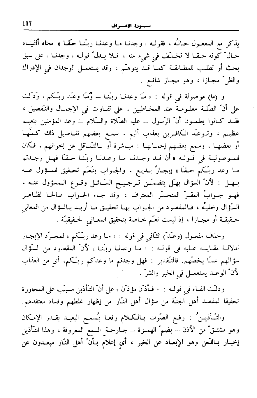 وَ (مَا) مَوْصُولَةٌ فِي قَوْلِهِ: مَا وَعَدَنا رَبُّنا- وَمَا وَعَدَ رَبُّكُمْ وَدَلَّتْ عَلَى أَنَّ الصِّلَةَ مَعْلُومَةٌ عِنْدَ الْمُخَاطَبِينَ، عَلَى تَفَاوُتٍ فِي الْإِجْمَالِ وَالتَّفْصِيلِ، فَقَدْ كَانُوا يَعْلَمُونَ أَنَّ الرَّسُولَ عَلَيْهِ الصَّلَاةُ وَالسَّلَامُ وَعَدَ الْمُؤْمِنِينَ بِنَعِيمٍ عَظِيمٍ، وَتَوَعَّدَ الْكَافِرِينَ بِعَذَابٍ أَلِيمٍ، سَمِعَ بَعْضُهُمْ تَفَاصِيلَ ذَلِكَ كُلَّهَا أَوْ بَعْضَهَا، وَسَمِعَ بَعْضُهُمْ إِجْمَالَهَا: مُبَاشَرَةً أَوْ بِالتَّنَاقُلِ عَنْ إِخْوَانِهِمْ، فَكَانَ لِلْمَوْصُولِيَّةِ فِي قَوْلِهِ: أَنْ قَدْ وَجَدْنا مَا وَعَدَنا رَبُّنا حَقًّا فَهَلْ وَجَدْتُمْ مَا وَعَدَ رَبُّكُمْ حَقًّا إِيجَازٌ بَدِيعٌ، وَالْجَوَابُ بنعم تَحْقِيق للمسؤول عَنْهُ بِهَلْ: لِأَنَّ السُّؤَالَ بِهَلْ يَتَضَمَّنُ تَرْجِيحَ السَّائِلِ وُقُوعَ الْمَسْئُولِ عَنْهُ، فَهُوَ جَوَابُ الْمُقِرِّ الْمُتَحَسِّرِ الْمُعْتَرِفِ، وَقَدْ جَاءَ الْجَوَابُ صَالِحًا لِظَاهِرِ السُّؤَالِ وَخَفِيِّهِ، فَالْمَقْصُودُ مِنَ الْجَوَابِ بِهَا تَحْقِيقُ مَا أُرِيدَ بِالسُّؤَالِ مِنَ الْمَعَانِي حَقِيقَةً أَوْ مَجَازًا، إِذْ لَيْسَتْ نَعَمْ خَاصَّةً بِتَحْقِيقِ الْمَعَانِي الْحَقِيقِيَّةِ.