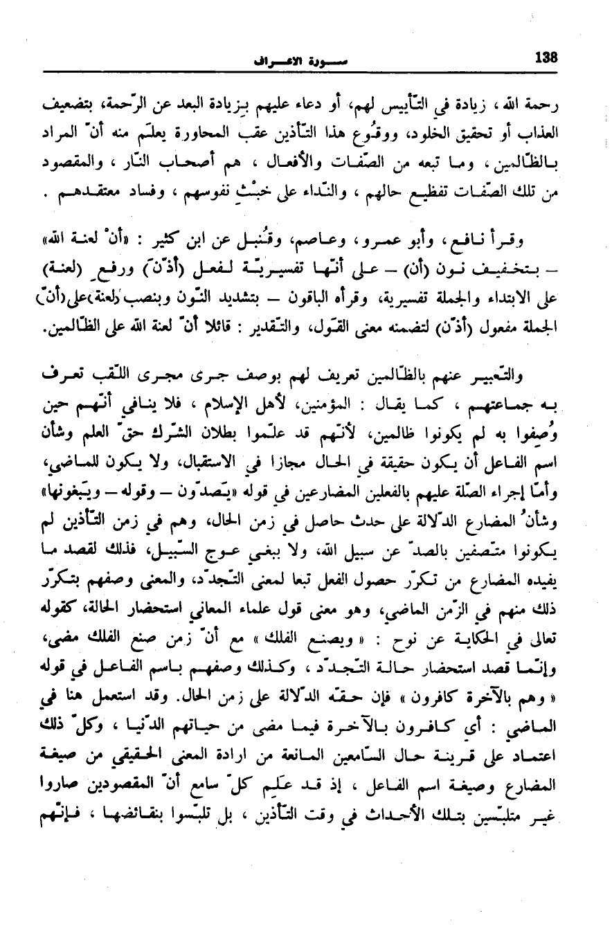 رَحْمَةِ اللَّهِ، زِيَادَةً فِي التَّأْيِيسِ لَهُمْ، أَوْ دُعَاءً عَلَيْهِمْ بِزِيَادَةِ الْبُعْدِ عَنِ الرَّحْمَةِ، بِتَضْعِيفِ الْعَذَابِ أَوْ تَحْقِيقِ الْخُلُودِ، وَوُقُوعُ هَذَا التَّأْذِينِ عَقِبَ الْمُحَاوَرَةِ يُعْلَمُ مِنْهُ أَنَّ الْمُرَادَ بِالظَّالِمِينَ، وَمَا تَبِعَهُ مِنَ الصِّفَاتِ وَالْأَفْعَالِ، هُمْ أَصْحَابُ النَّارِ، وَالْمَقْصُودُ مِنْ تِلْكَ الصِّفَاتِ تَفْظِيعُ حَالِهِمْ، وَالنِّدَاءُ عَلَى خُبْثِ نُفُوسِهِمْ، وَفَسَادِ مُعْتَقَدِهِمْ.