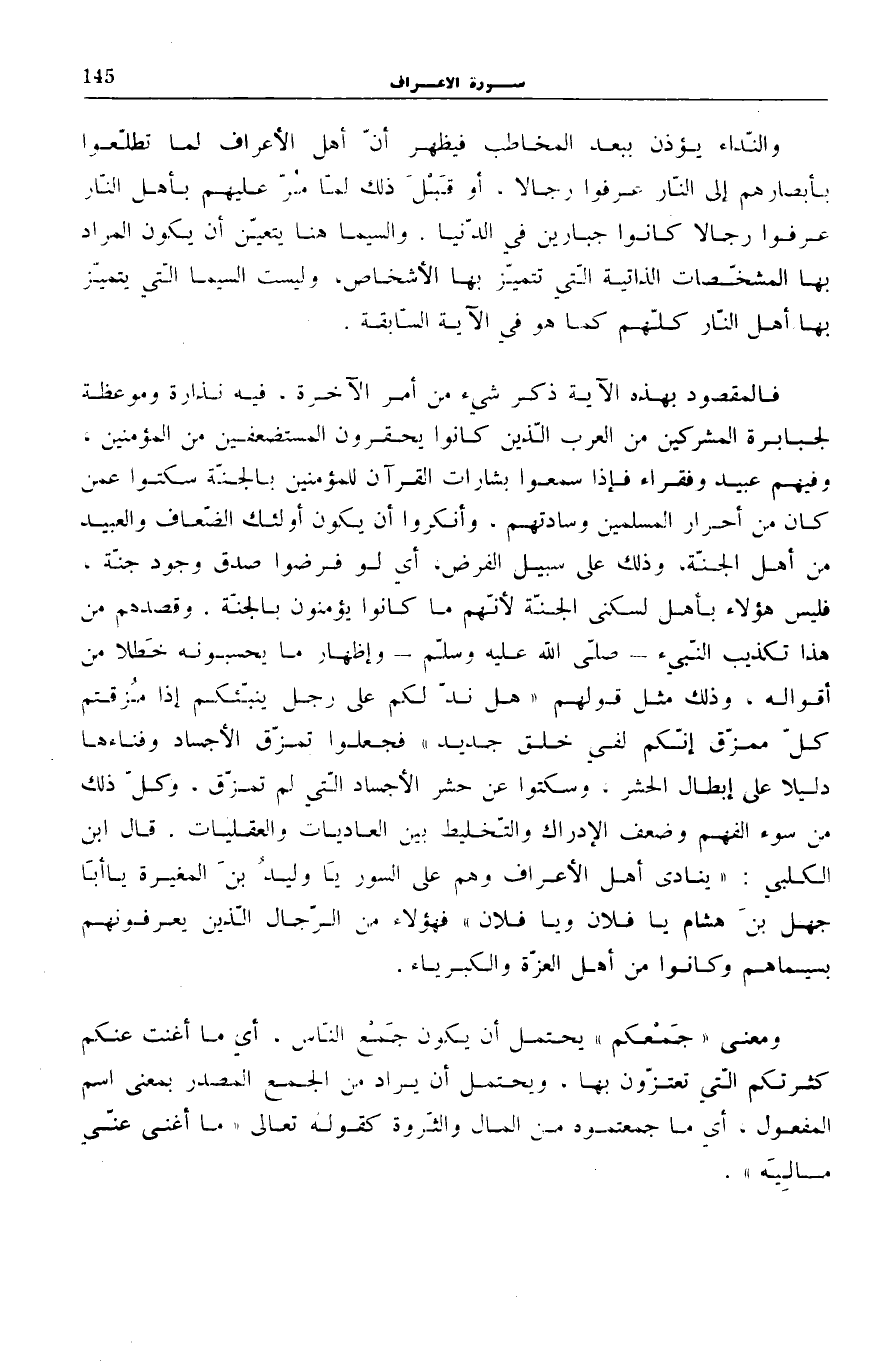 قَالَ ابْنُ الْكَلْبِيِّ: «يُنَادِي أَهْلُ الْأَعْرَافِ وَهُمْ عَلَى السُّورِ يَا وَلِيدُ بْنَ الْمُغِيرَةِ يَا أَبَا جَهْلَ بْنَ هِشَامٍ يَا فُلَانُ وَيَا فُلَانُ» فَهَؤُلَاءِ مِنَ الرِّجَالِ الَّذِينَ يَعْرِفُونَهُمْ بِسِيمَاهُمْ وَكَانُوا مِنْ أَهْلِ الْعِزَّةِ وَالْكِبْرِيَاءِ.