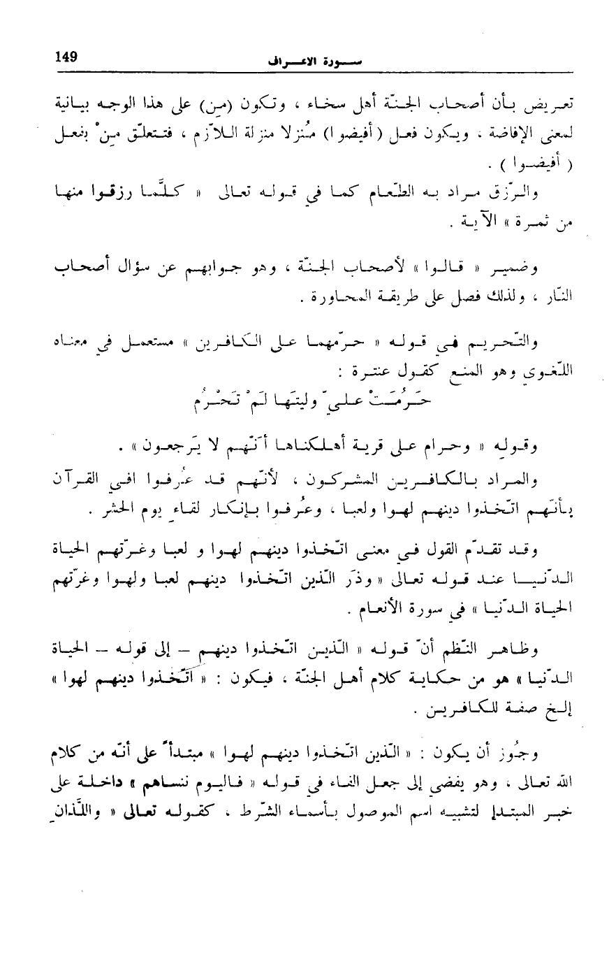 وَظَاهِرُ النَّظْمِ أَنَّ قَوْلَهُ: الَّذِينَ اتَّخَذُوا دِينَهُمْ- إِلَى قَوْلِهِ- الْحَياةُ الدُّنْيا هُوَ مِنْ حِكَايَةِ كَلَامِ أَهْلِ الْجَنَّةِ، فَيَكُونُ: اتَّخَذُوا دِينَهُمْ لَهْواً إِلَخْ صِفَةً لِلْكَافِرِينَ.